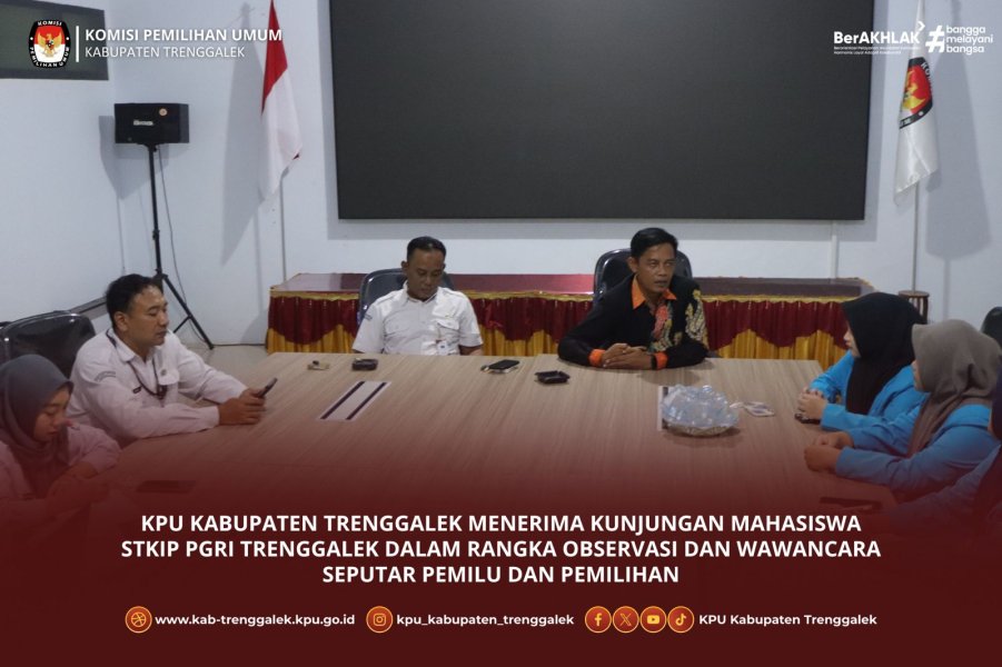 Hari ini Senin, 6 Oktober 2025, bertempat di Media Center, Komisi Pemilihan Umum Kabupaten Trenggalek menerima kunjungan rombongan mahasiswa STKIP PGRI Trenggalek. Kunjungan tersebut dilakukan dalam rangka observasi dan wawancara seputar pemilu dan pemilihan.