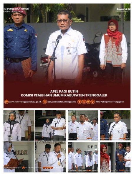 Hari ini, Senin, tanggal 13 Oktober 2025, Komisi Pemilihan Umum Kabupaten Trenggalek menyelenggarakan Apel Pagi Rutin. Apel dilaksanakan di halaman Kantor KPU Kabupaten Trenggalek dan dikuti oleh Ketua KPU Kabupaten Trenggalek, dan Sekretaris beserta jajaran Sekretariat KPU Kabupaten Trenggalek. Dalam kesempatan ini, bertindak sebagai Pembina Apel adalah Nanang Eko Prasetyo, Sekretaris KPU Kabupaten Trenggalek. Sedangkan sebagai Pemimpin Apel adalah Akhmad Rudy Bastari, Kepala Subbagian Keuangan, Umum, dan Logistik.