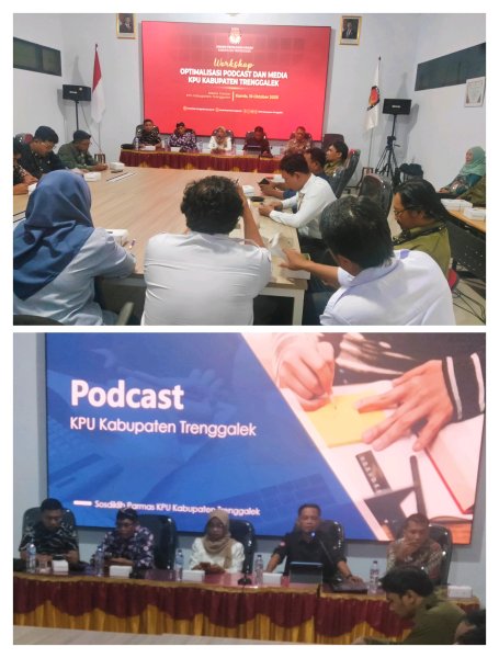 Hari ini, Kamis, tanggal 16 Oktober 2025, Komisi Pemilihan Umum Kabupaten Trenggalek menyelenggarakan kegiatan Workshop Optimalisasi Podcast dan Media. Kegiatan yang diselenggarakan di Aula Kantor KPU Kabupaten Trenggalek tersebut diikuti oleh Ketua, Anggota KPU Kabupaten Trenggalek, Sekretaris beserta jajaran Sekretariat KPU Kabupaten Trenggalek serta Bakesbangpol Kabupaten Trenggalek yang diwakili oleh Maryani, Kepala Bidang Kesatuan Bangsa Bakesbangpol Kabupaten Trenggalek. Kegiatan tersebut dimulai pukul 09.00 WIB oleh MC, Wulan Styaningsih Pangesti, Pelaksana Subbag Perencanaan, Data dan Informasi.
