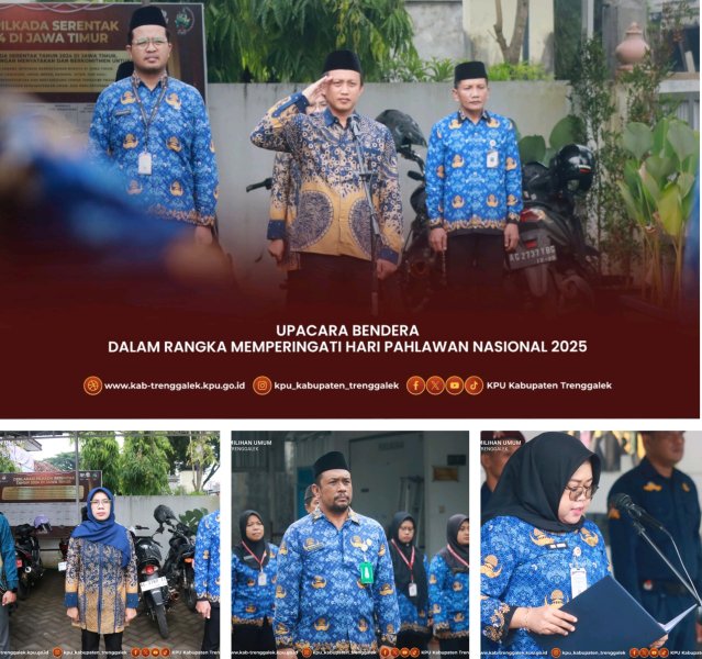 Hari ini, Senin, tanggal 10 November 2025, Komisi Pemilihan Umum Kabupaten Trenggalek menyelenggarakan Upacara Peringatan Hari Pahlawan. Upacara bendera yang diselenggarakan di halaman Kantor KPU Kabupaten Trenggalek tersebut diikuti oleh Ketua, seluruh Anggota KPU Kabupaten Trenggalek, dan Sekretaris beserta jajaran Sekretariat KPU Kabupaten Trenggalek. Bertindak sebagai Pembina Upacara adalah Mahbubil Umam, Anggota KPU Kabupaten Trenggalek Ketua Divisi Perencanaan, Data, dan Informasi. Sedangkan sebagai Komandan Upacara adalah Akhmad Rudy Bastari, Kasubbag Keuangan, Umum dan Logistik. Adapun petugas lainnya dalam Upacara tersebut adalah sebagai petugas pengibar bendera Merah-Putih adalah Erwin Wahyudi, Rokhip Abduloh, Deni Dwi Kristanto, ketiganya merupakan pelaksana pada Subbagian Keuangan, Umum dan Logistik sekaligus Jagat Saksana KPU Kabupaten Trenggalek, sebagai pembawa acara/protokol adalah Lilis Suryani, pelaksana pada Subbagian Teknis Penyelenggaraan Pemilu dan Hukum, sebagai Pembaca Pembukaan UUD Tahun 1945 adalah Yunike Ayuning Priyastuti, pelaksana pada Subbagian Partisipasi Masyarakat dan SDM, sebagai Pembaca Pesan-Pesan Pahlawan adalah Al Imron, pelaksana pada Subbagian Perencanaan Data dan Informasi, sebagai Pembaca Doa adalah Zaenal Afandhi, pelaksana pada Subbagian Keuangan, Umum dan Logistik. Upacara bendera dimulai pada pukul 08.00 WIB oleh Lilis Suryani, pelaksana pada Subbagian Teknis Penyelenggaraan Pemilu dan Hukum.