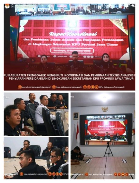 Hari ini, Rabu, 12 November 2025, Komisi Pemilihan Umum Kabupaten Trenggalek mengikuti Rapat Koordinasi dan Pembinaan Teknis Analisis serta Penyiapan Persidangan yang diselenggarakan oleh KPU Provinsi Jawa Timur melalui media daring (zoom meeting). Hadir dalam kegiatan daring tersebut Sekretaris KPU Kabupaten Trenggalek beserta jajaran Sekretariat KPU Kabupaten Trenggalek.