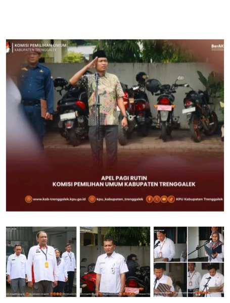 Hari ini, Senin, tanggal 24 November 2025, Komisi Pemilihan Umum Kabupaten Trenggalek menyelenggarakan Apel Pagi Rutin. Kegiatan yang diselenggarakan di halaman Kantor KPU Kabupaten Trenggalek tersebut diikuti oleh Anggota KPU Kabupaten Trenggalek, Sekretaris beserta jajaran Sekretariat KPU Kabupaten Trenggalek. Bertindak sebagai Pembina Apel adalah Tri Andoko, Anggota KPU Kabupaten Trenggalek Ketua Divisi Hukum dan Pengawasan. Sedangkan sebagai Pemimpin Apel adalah Darmaji, Pelaksana pada Subbagian Partisipasi Masyarakat dan Sumber Daya Manusia. Adapun petugas lainnya dalam Apel Pagi tersebut adalah sebagai Pembawa Acara yaitu Whanti Purwaningsih, Pelaksana pada Subbagian Teknis Penyelenggaraan Pemilu dan Hukum, Pembaca Pembukaan UUD 1945 adalah Denico Sagita Prima, Pelaksana pada Subbagian Teknis Penyelenggaraan Pemilu dan Hukum, Pembaca Doa adalah Agus Widodo, Pelaksana pada Subbagian Keuangan, Umum, dan Logistik, sebagai Pembaca Panca Prasetya KORPRI adalah Rudi Susanto, Pelaksana pada Subbagian Perencanaan, Data, dan Informasi, serta sebagai Ajudan Pembina Apel dalah Erwin Wahyudi, Pelaksana pada Subbagian Keuangan, Umum, dan Logistik sekaligus Jagat Saksana KPU Kabupaten Trenggalek.