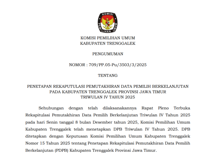 PENGUMUMAN NOMOR: 709/PP.05-Pu/3503/3/2025 TENTANG PENETAPAN REKAPUTULASI PEMUTAKHIRAN DATA PEMILIH BERKELANJUTAN PADA KABUPATEN TRENGGALEK PROVINSI JAWA TIMUR TRIWULAN IV TAHUN 2025