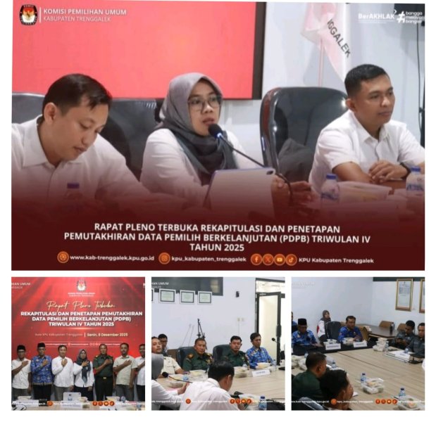 Menandai penyelesaian penyelenggaraan Pemutakhiran Data Pemilih Berkelanjutan (PDPB) Tahun 2025 Komisi Pemilihan Umum (KPU) Kabupaten Trenggalek menyelenggarakan Rapat Pleno Terbuka Penetapan Rekapitulasi PDPB, Senin (8/12/2025). Rekapitulasi dan Penetapan Hasil PDPB Triwulan IV Tahun 2025 ini diselenggarakan di Aula Kantor KPU Kabupaten Trenggalek tersebut dihadiri oleh Polres Trenggalek, KODIM 0806 Trenggalek, Dispendukcapil Kabupaten Trenggalek, Bakesbangpol Kabupaten Trenggalek, Rutan II B Trenggalek, dan Bawaslu Kabupaten Trenggalek.