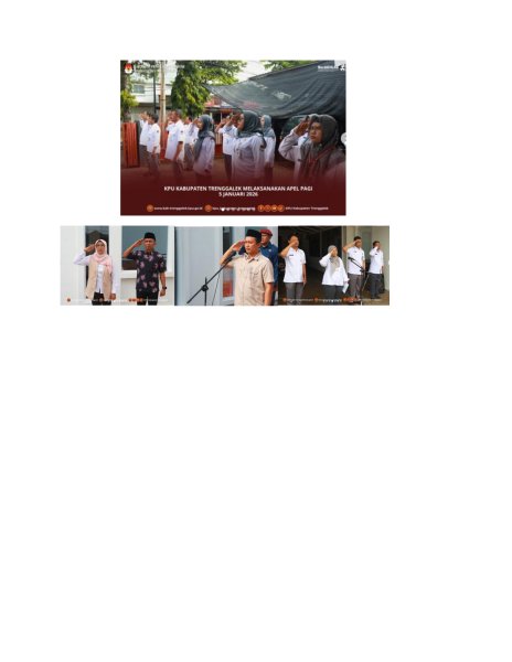 Hari ini, Senin, tanggal 5 Januari 2026, Komisi Pemilihan Umum Kabupaten Trenggalek menyelenggarakan Apel Pagi Rutin. Kegiatan yang diikuti oleh Ketua dan seluruh Anggota KPU Kabupaten Trenggalek, Sekretaris beserta jajaran Sekretariat KPU Kabupaten Trenggalek tersebut dilaksanakan dengan penuh khidmat di halaman Kantor KPU Kabupaten Trenggalek. Bertindak sebagai Pembina Apel adalah Mahbubil Umam, Anggota KPU Kabupaten Trenggalek Ketua Divisi Perencanaan, Data, dan Informasi. Sedangkan sebagai Pemimpin Apel adalah Akhmad Rudy Bastari, Kepala Subbagian Keuangan, Umum, dan Logistik. Adapun petugas lainnya dalam apel pagi rutin tersebut adalah sebagai MC/protokol adalah Woro Wikan Maheswari, pelaksana pada Subbagian Partisipasi Masyarakat dan Sumber Daya Manusia, sebagai Pembaca Pembukaan UUD Tahun 1945 adalah Deniko Sagita Prima, pelaksana pada Subbagian Keuangan, Umum, dan Logistik, sebagai Pembaca Panca Prasetya KORPRI adalah Al Imron, pelaksana pada Subbagian Teknis Penyelenggaraan Pemilu dan Hukum, sebagai Pembaca Doa adalah Abdul Basith Umami, pelaksana pada Subbagian Teknis Penyelenggaraan Pemilu dan Hukum, dan sebagai Ajudan Pembina Apel adalah Erwin Wahyudi, pelaksana pada Subbagian Keuangan, Umum, dan Logistik sekaligus Jagat Saksana KPU Kabupaten Trenggalek. Apel pagi dimulai pada pukul 08.00 WIB oleh MC/Protokol, Woro Wikan Maheswari, pelaksana pada Subbagian Partisipasi Masyarakat dan Sumber Daya Manusia.