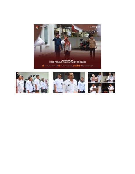 Hari ini, Senin, 12 Januari 2026, Komisi Pemilihan Umum Kabupaten Trenggalek menyelenggarakan Apel Pagi Rutin. Kegiatan yang dilaksanakan di halaman Kantor KPU Kabupaten Trenggalek tersebut diikuti oleh Ketua, seluruh Anggota KPU Kabupaten Trenggalek, Sekretaris beserta jajaran Sekretariat KPU Kabupaten Trenggalek. Bertindak sebagai Pembina Apel adalah Istatiin Nafiah, Ketua KPU Kabupaten Trenggalek. Sedangkan sebagai Pemimpin Apel adalah Al Imron, pelaksana pada Subbagian Teknis Penyelenggaraan Pemilu dan Hukum. Adapun petugas lainnya yaitu sebagai MC/protokol adalah Yunike Ayuning Priyastuti, pelaksana pada subbagian Partisipasi Masyarakat dan Sumber Daya Manusia, sebagai Pembaca Pembukaan UUD 1945 adalah Wulan Styaningsih Pangesti, pelaksana pada Subbagian Perencanaan, Data, dan Informasi, sebagai Pembaca Panca Prasetya KORPRI adalah Denico Sagita Prima, pelaksana pada Subbagian Keuangan, Umum, dan Logistik, sebagai Pembaca Doa adalah Agus Widodo, pelaksana Subbagian Keuangan, Umum, dan Logistik, serta sebagai Ajudan Pembina Apel adalah Erwin Wahyudi, pelaksana pada Subbagian Keuangan, Umum, dan Logistik sekaligus Jagat Saksana KPU Kabupaten Trenggalek. Apel pagi dimulai pukul 08.00 WIB oleh MC/Protokol, Yunike Ayuning Priyastuti, pelaksana pada Subbagian Partisipasi Masyarakat dan Sumber Daya Manusia.