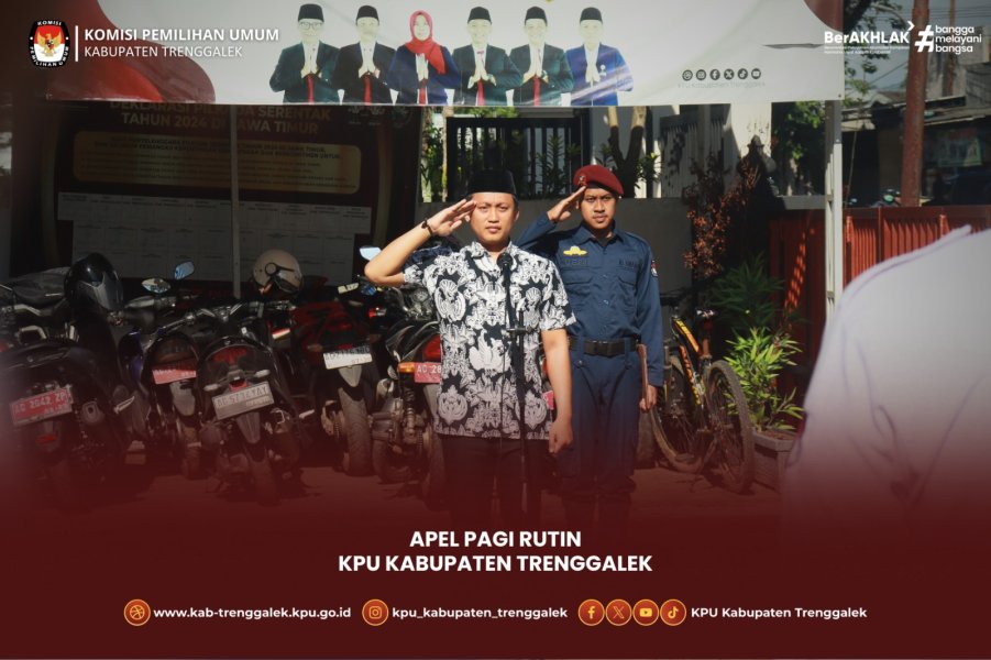 Hari ini, Senin, tanggal 2 Februari 2026, Komisi Pemilihan Umum Kabupaten Trenggalek menyelenggarakan Apel Pagi Rutin. Kegiatan yang dilaksanakan di halaman Kantor KPU Kabupaten Trenggalek tersebut diikuti oleh Ketua, seluruh Anggota KPU Kabupaten Trenggalek, beserta jajaran Sekretariat KPU Kabupaten Trenggalek. Bertindak sebagai Pembina Apel adalah Mahbubil Umam, Anggota KPU Kabupaten Trenggalek Ketua Divisi Perencanaan, Data dan Informasi. Sedangkan sebagai Pemimpin Apel adalah Akhmad Rudy Bastari, Kepala Subbagian Keuangan, Umum dan Logistik. Adapun petugas lainnya adalah sebagai Pembawa Acara/Protokol adalah Wulan Styaningsih Pangesti, Pelaksana Subbag Perencanaan, Data dan Informasi, sebagai Pembaca Pembukaan UUD Tahun 1945 adalah Yunike Ayuning Priyastuti, pelaksana pada Subbagian Partisipasi Masyarakat dan Sumber Daya Manusia, sebagai Pembaca Panca Prasetya KORPRI adalah Woro Wikan Maheswari, pelaksana pada Subbagian Partisipasi Masyarakat dan Sumber Daya Manusia, sebagai Pembaca Doa adalah Agus Widodo, pelaksana pada Subbagian Keuangan, Umum dan Logistik, sebagai petugas dokumentasi dan perlengkapan adalah Ma’ruf Hasan Fuady, pelaksana pada Subbagian Partisipasi Masyarakat dan Sumber Daya Manusia, dan sebagai Ajudan Pembina Apel adalah Deni Dwi Kristanto, pelaksana pada Subbagian Keuangan, Umum dan Logistik sekaligus Jagat Saksana KPU Kabupaten Trenggalek. Apel pagi dimulai tepat pukul 08.00 WIB oleh Pembawa Acara/Protokol, Wulan Styaningsih Pangesti, Pelaksana Subbagian Perencanaan, Data dan Informasi.