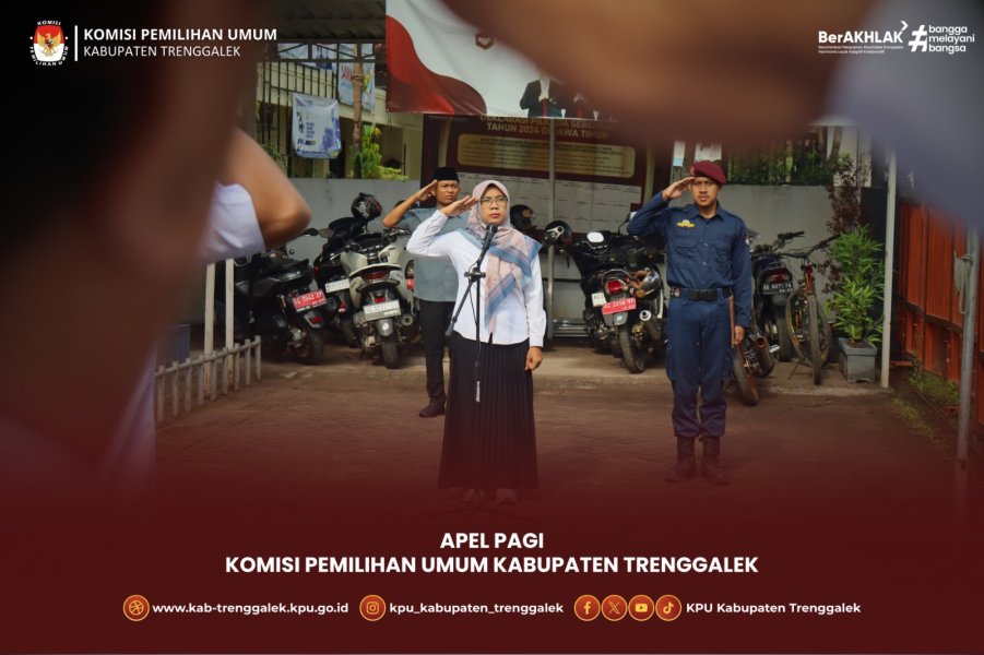 Hari ini, Senin, tanggal 9 Februari 2026, Komisi Pemilihan Umum Kabupaten Trenggalek menyelenggarakan Apel Pagi Rutin. Kegiatan yang diselenggarakan di halaman Kantor KPU Kabupaten Trenggalek tersebut diikuti oleh Ketua, seluruh Anggota KPU Kabupaten Trenggalek, Sekretaris beserta jajaran Sekretariat KPU Kabupaten Trenggalek. Bertindak sebagai Pembina Apel adalah Istatiin Nafiah, Ketua KPU Kabupaten Trenggalek. Sedangkan sebagai Pemimpin Apel adalah Ichsanuadi Rosyid Trianto Putro, Plt. Kasubbag Teknis Penyelenggaraan Pemilu dan Hukum. Adapun petugas lainnya adalah sebagai pembawa acara/MC adalah Lilis Suryani, pelaksana pada Subbagian Teknis Penyelenggaraan Pemilu dan Hukum, sebagai Pembaca Pembukaan UUD 1945 adalah Yunike Ayuning Priyastuti, pelaksana pada subbagian Partisipasi Masyarakat dan Sumber Daya Manusia, sebagai pembaca doa adalah Agus Widodo, pelaksana pada subbagian Keuangan, Umum, dan Logistik, sebagai Pembaca Panca Prasetya KORPRI adalah Satrio Adi Winugroho, pelaksana pada subbagian Keuangan, Umum, dan Logistik, petugas perlengkapan dan dokumentasi adalah Ma’ruf Hasan Fuady, pelaksana pada subbagian Partisipasi Masyarakat dan Sumber Daya Manusia, serta sebagai Ajudan Pembina Apel adalah Deni Dwi Kristanto, pelaksana pada Subbagian Keuangan, Umum, dan Logistik sekaligus Jagat Saksana KPU Kabupaten Trenggalek. Apel pagi dimulai tepat pukul 08.00 WIB oleh pembawa acara/MC, Lilis Suryani, pelaksana pada subbagian Teknis Penyelenggaraan Pemilu dan Hukum.