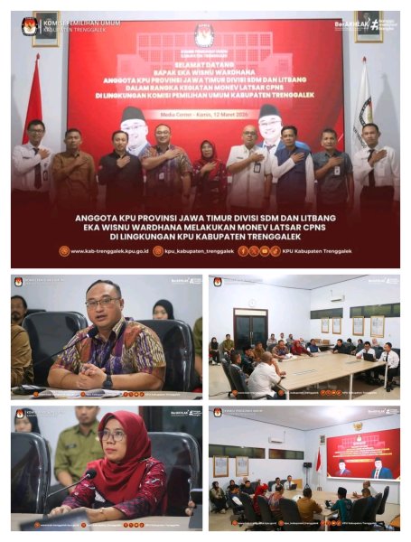 Hari ini, Kamis, tanggal 12 Maret 2026, pukul 11.30 WIB, Komisi Pemilihan Umum (KPU) Kabupaten Trenggalek mendapat kunjungan dari Anggota KPU Provinsi Jawa Timur, Eka Wisnu Wardhana. Kunjungan Anggota KPU Provinsi Jawa Timur Ketua Divisi SDM dan Litbang tersebut diterima secara resmi oleh Ketua, seluruh Anggota, KPU Kabupaten Trenggalek, dan Sekretaris beserta jajaran Sekretariat KPU Kabupaten Trenggalek.