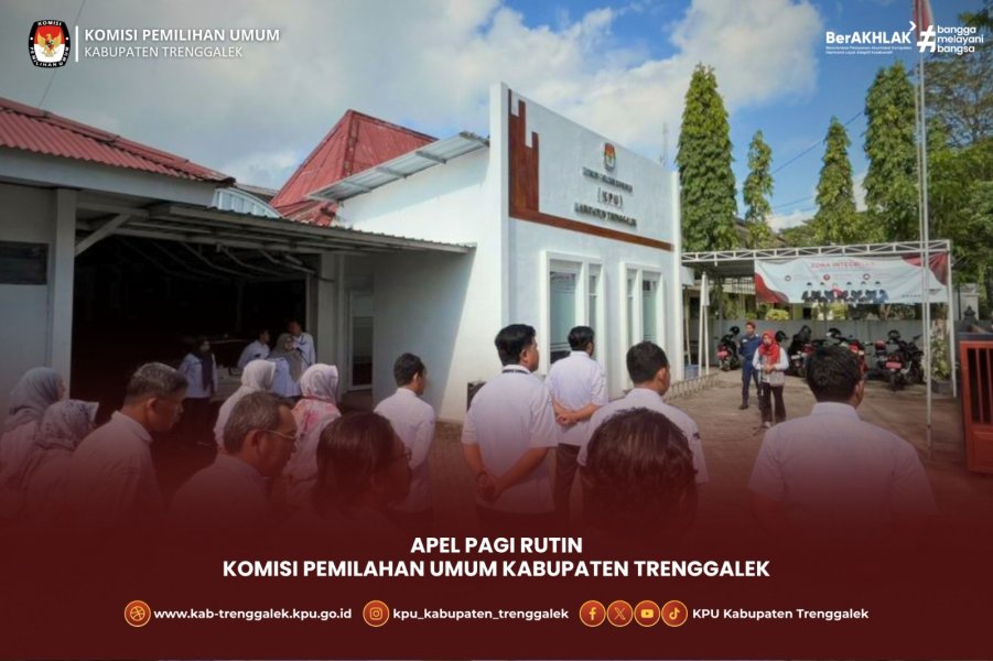 Hari ini, Senin, tanggal 30 Maret 2026, Komisi Pemilihan Umum Kabupaten Trenggalek menyelenggarakan Apel Pagi Rutin. Kegiatan yang diselenggarakan di halaman Kantor KPU Kabupaten Trenggalek tersebut diikuti oleh Ketua KPU Kabupaten Trenggalek beserta jajaran Sekretariat KPU Kabupaten Trenggalek. Bertindak sebagai Pembina Apel adalah Istatiin Nafiah, Ketua KPU Kabupaten Trenggalek . Sedangkan sebagai Pemimpin Apel adalah Agung Tri Laksana, pelaksana Subbagian Partisipasi Masyarakat, dan Sumber Daya Manusia. Adapun petugas lainnya meliputi sebagai Pembawa Acara/MC adalah Wulan Styaningsih Pangesti, pelaksana Subbagian Perencanaan, Data dan Informasi, sebagai Pembaca Pembukaan UUD 1945 adalah Yunike Ayuning Priyastuti, pelaksana Subbagian Partisipasi Masyarakat, dan SDM, sebagai Pembaca Panca Prasetya KORPRI adalah Chormen Rukmawan, pelaksana Subbagian Keuangan, Umum, dan Logistik, sebagai Pembaca Doa adalah Darmaji, pelaksana Subbagian Partisipasi Masyarakat dan SDM, dan sebagai Ajudan Pembina Apel adalah Rokhip Abduloh, pelaksana pada Subbagian Keuangan, Umum, dan Logistik sekaligus Jagat Saksana KPU Kabupaten Trenggalek. Apel pagi ini dilaksanakan di suasana lebaran Idul Fitri 1447 Hijriyah. Apel pagi dimulai tepat pukul 08.00 WIB oleh Pembawa Acara/MC, Wulan Styaningsih Pangesti, pelaksana pada Subbagian Perencanaan, Data, dan Informasi.