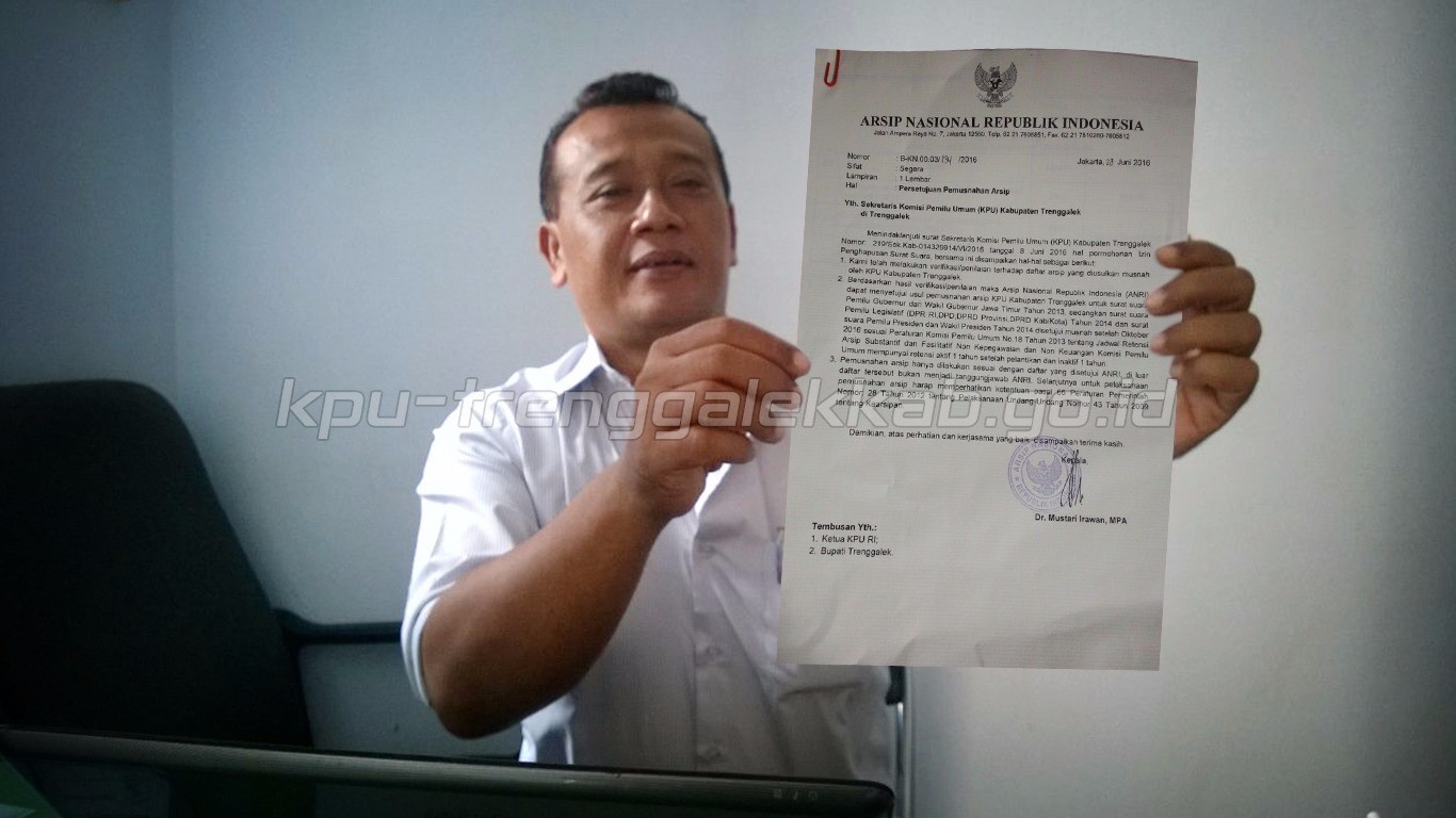 KPU-TRENGGALEKKAB.GO.ID. Penyelesaian masalah penghapusan tumpukan logistik bekas surat Pilgub Jatim 2013, Pileg dan pilpres 2014 yang memenuhi gudang KPU Kabupaten Trenggalek nampaknya mulai ada titik terang dengan terbitnya ijin dari ANRI (Arsip Nasional Republik Indonesia) melalui surat Nomor B-KN.00.03/134/2016 tertanggal 28 Juni 2016, Perihal Pemusnahan Arsip. Surat persetujuan yang ditandatangani oleh Dr. Mustari Irawan Kepala ANRI tersebut merupakan jawaban yang ditunggu atas permohonan ijin penghapusan surat suara melalui Surat Sekretaris KPU Kabupaten Trenggalek Nomor 219/Sek.Kab-013329914/VI/2016 tanggal 8 Juni 2016. “Alhamdulillah, dengan terbitnya surat ini memberikan kejelasan kepada kami untuk mengmbil langkah-langkah teknis dalam proses penghapusan bekas suarat suara yang selama ini cukup meresahkan dan membebani tempat penyimpanan dan pengamanan di KPU Trenggalek”, kata Wiratno.