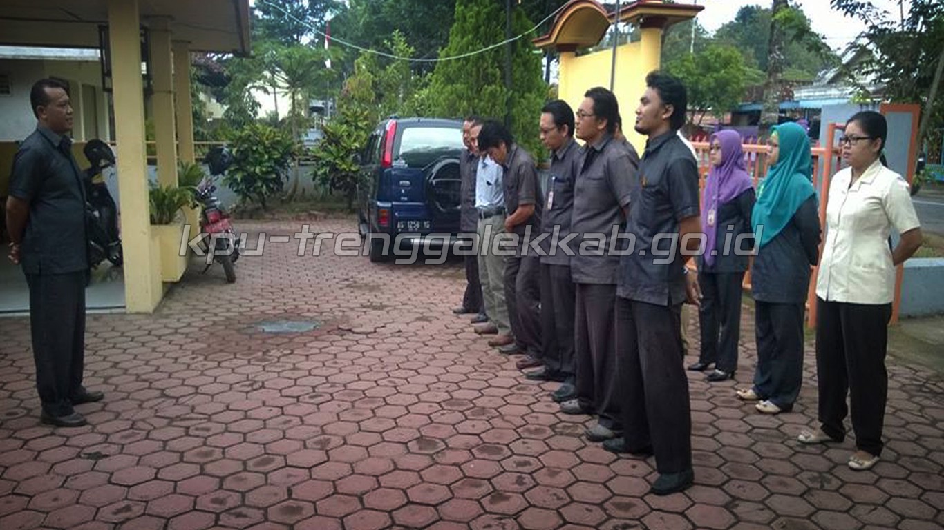KPU-TRENGGALEKKAB.GO.ID - Sekitar pukul 07.30 WIB para pegawai di kesekretariatan dan komisioner KPU Kabupaten Trenggalek sudah berkumpul di halaman kantor. Suasana langit mendung karena setengah jam sebelumnya hujan rintik-rintik turun. Untungnya gerimis sudah reda. Maka, acara apel awal pekan kali ini berjalan lancar tanpa gangguan sama sekali.
