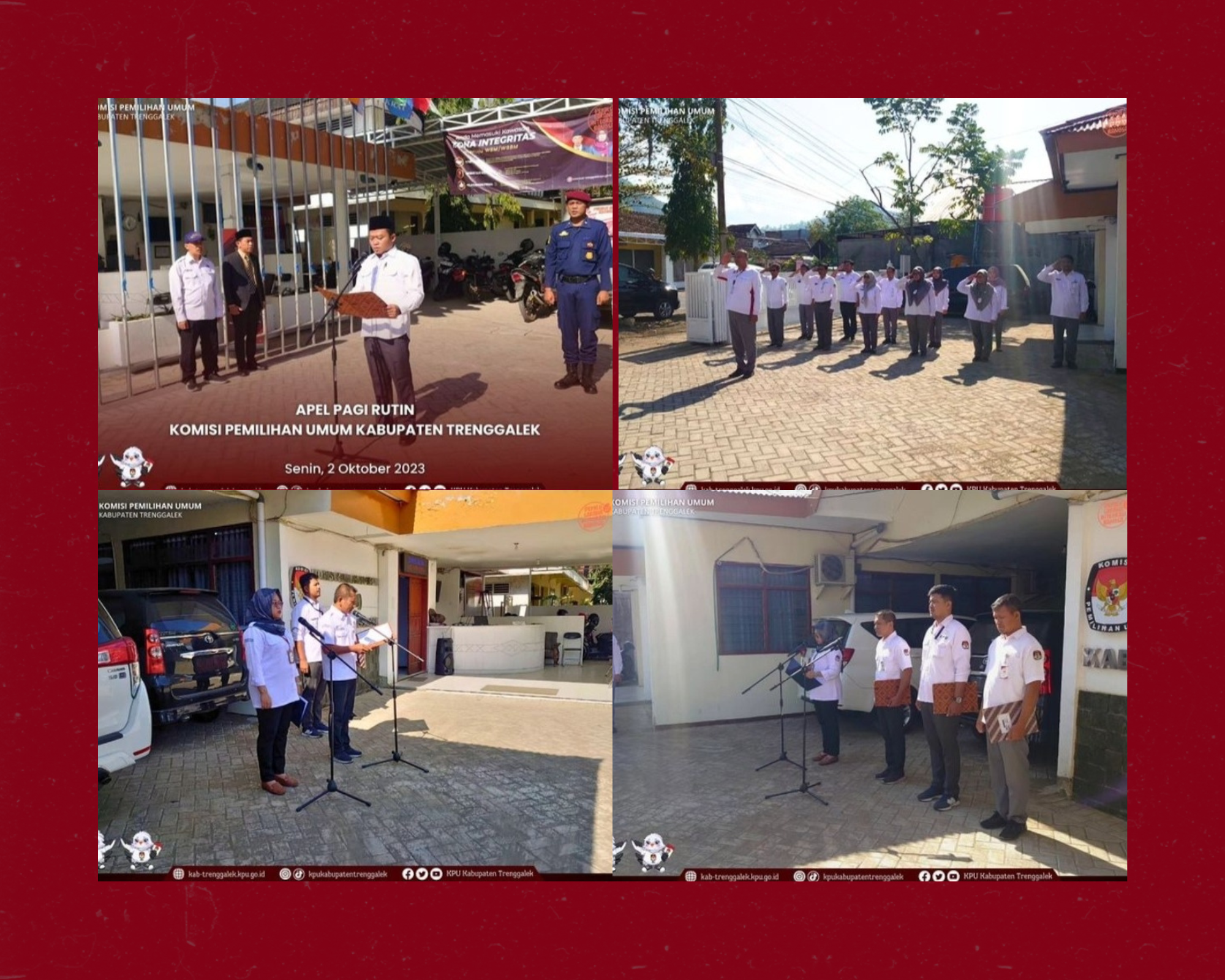 Hari ini, Senin, tanggal 2 Oktober 2023, Komisi Pemilihan Umum Kabupaten Trenggalek menyelenggarakan Apel Pagi Rutin yang diselenggarakan setiap hari Senin. Apel pagi dilaksanakan di halaman Kantor KPU Kabupaten Trenggalek dan diikuti oleh seluruh pegawai KPU Kabupaten Trenggalek. Apel pagi dimulai oleh MC, Lilis Suryani, tepat pada pukul 08.00 WIB. Bertindak sebagai Pemimpin Apel yaitu Darmaji. Sedangkan Pembina Apel yaitu Muhammad Indra Setiawan, Anggota KPU Kabupaten Trenggalek Divisi Perencanaan, Data, dan Informasi. Setelah dilakukan penghormatan dan laporan kepada Pembina Apel, Pemimpin Apel memimpin penghormatan kepada Bendera Merah-Putih diiringi Lagu Kebangsaan Indonesia Raya. Selanjutnya Mengheningkan Cipta dipimpin oleh Pembina Apel. Acara dilanjutkan dengan Pembacaan Pancasila oleh Pembina Apel yang diikuti oleh seluruh peserta Apel. Dilanjutkan dengan Pembacaan Pembukaan Undang-Undang Dasar Negara Republik Indonesia Tahun 1945 oleh petugas Apel, Ichsanuadi Rosyid, dan Panca Prasetya Korps Pegawai Republik Indonesia oleh petugas Apel, Nanang Eko Prasetyo, Kasubbag Teknis Penyelenggaraan Pemilu, Partisipasi dan Hubungan Masyarakat. Setelah itu amanat Pembina Apel.