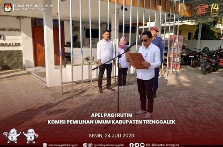 Hari ini, Senin, tanggal 24 Juli 2023, di halaman Kantor KPU Kabupaten Trenggalek tampak berjajar rapi seluruh pegawai KPU Kabupaten Trenggalek mengikuti Apel Pagi Rutin. Apel tersebut dimulai tepat pukul 08.00 WIB dimulai oleh MC, Whanti Purwaningsih. Apel dipimpin oleh Akhmad Rudy Bastari, Kasubbag Keuangan, Umum dan Logistik. Bertindak sebagai Pembina Apel adalah Gembong Derita Hadi, Ketua KPU Kabupaten Trenggalek. Apel diawali dengan Penghormatan dan Laporan kepada Pembina Apel. Setelah laporan dilakukan Penghormatan kepada Bendera Merah-Putih diiringi dengan Menyanyikan Lagu Kebangsaan Indonesia Raya. Kegiatan dilanjutkan dengan Mengheningkan Cipta dipimpin oleh Pembina Apel. Selanjutnya Pembacaan Pancasila dipimpin oleh Pembina Apel dan diikuti oleh seluruh peserta, Pembukaan Undang-undang Dasar Negara Republik Indonesia Tahun 1945 oleh Dian Satriana, dan Pembacaan Panca Prasetya Korps Pegawai Republik Indonesia oleh Minuk Wijayanti.