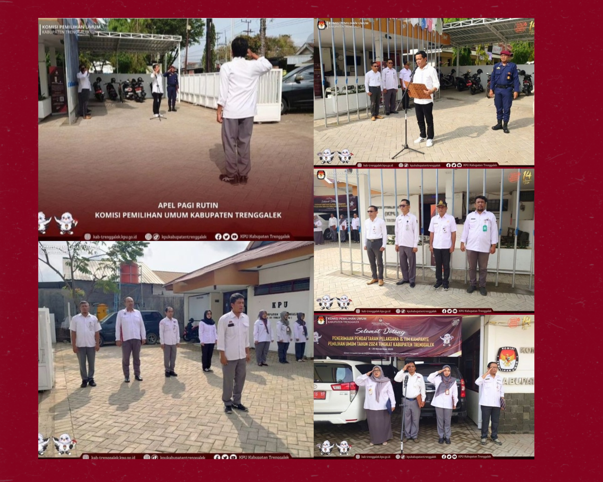 Hari ini, Senin, tanggal 27 November 2023, Di halaman Kantor Komisi Pemilihan Umum Kabupaten Trenggalek berbaris rapi seluruh pegawai KPU Kabupaten Trenggalek mengikuti Apel Pagi Rutin Senin. Apel dilaksanakan sebagai wujud kedisiplinan dalam bekerja. Apel dimulai pukul 08.00 WIB oleh MC, Wulan Styaningsih. Bertindak sebagai Pemimpin Apel adalah Chormen Rukmawan dan sebagai Pembina Apel adalah Imam Nurhadi, Anggota KPU Kabupaten Trenggalek Divisi Hukum dan Pengawasan. Setelah dilakukan penghormatan dan laporan kepada Pembina Apel, dilaksanakan Penghormatan Bendera Merah-Putih diiringi Lagu Kebangsaan Indonesia Raya dan Mengheningkan Cipta. Apel berlanjut dengan Pembacaan Pancasila dipimpin oleh Pembina Apel diikuti oleh seluruh peserta Apel. Selanjutnya, Pembacaan Pembukaan Undang-Undang Dasar Negara Republik Indonesia Tahun 1945 oleh petugas, Yunike Ayuning dan dilanjutkan dengan Pembacaan Panca Prasetya Korps Pegawai Republik Indonesia oleh petugas, Al Imron. Apel dilanjutkan dengan amanat Pembina Apel.