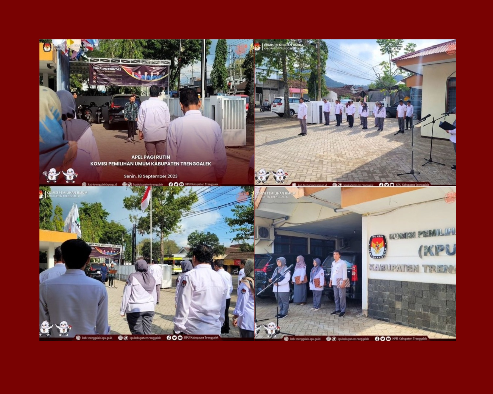 Hari ini, Senin, tanggal 18 September 2023, KPU Kabupaten Trenggalek menyelenggarakan Apel Pagi. Kegiatan tersebut dilaksanakan di Halaman Kantor KPU Kabupaten Trenggalek. Tampak seluruh pegawai KPU Kabupaten Trenggalek berbaris rapi mengikuti apel pagi dengan khidmat. Apel pagi dipimpin oleh Akhmad Rudy Bastari, Kasubbag Keuangan Umum, dan Logistik. Sedangkan bertindak sebagai Pembina Apel adalah Gembong Derita Hadi, Ketua KPU Kabupaten Trenggalek. Apel dimulai tepat pukul 08.00 WIB oleh MC, Whanti Purwaningsih. Setelah dilakukan Penghormatan dan Laporan kepada Pembina Apel, Pemimpin Apel memimpin Penghormatan kepada Bendera Merah-Putih diiringi Lagu Kebangsaan Indonesia. Apel dilanjutkan dengan Mengheningkan Cipta dan Pembacaan Pancasila dipimpin oleh Pembina Apel. Setelah itu, dilanjutkan dengan Pembacaan Pembukaan Undang-Undang Dasar Negara Republik Indonesia Tahun 1945 oleh Dian Satriana dan Panca Prasetya Korps Pegawai Republik Indonesia oleh Minuk Wijayanti. Apel dilanjutkan dengan amanat Pembina Apel.