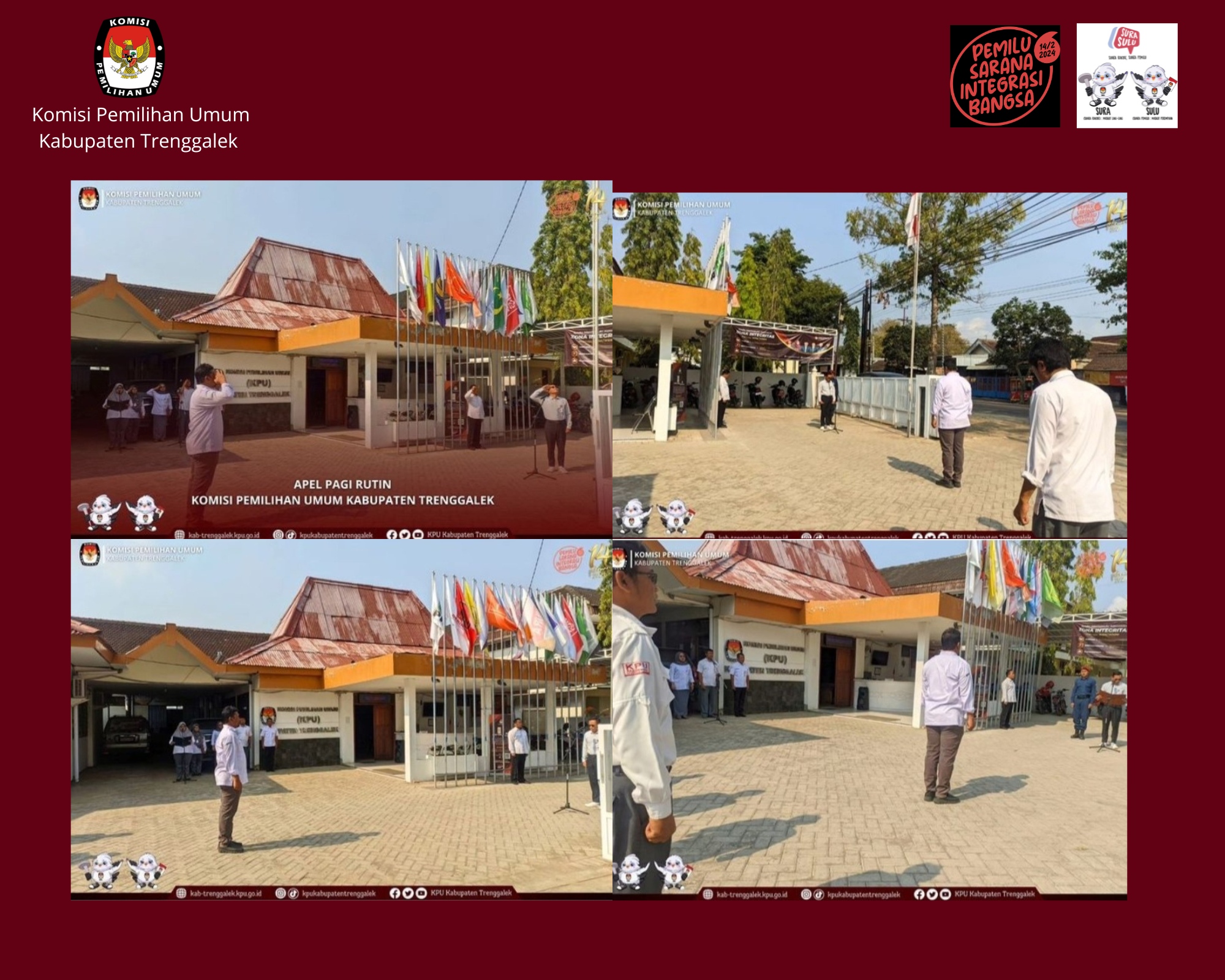 Hari ini, Senin, tanggal 23 November 2023, Komisi Pemilihan Umum Kabupaten Trenggalek menyelenggarakan Apel Pagi Rutin di halaman Kantor KPU Kabupaten Trenggalek. Apel tersebut diikuti oleh seluruh pegawai KPU Kabupaten Trenggalek. Bertindak sebagai Pembina Apel adalah Gembong Derita Hadi, Ketua KPU Kabupaten Trenggalek dan pemimpin Apel adalah Akhmad Rudy Bastari, Kasubbag Keuangan, Umum, dan Logistik. Apel dimulai tepat pukul 08.00 WIB oleh MC. Setelah dilakukan Penghormatan dan Laporan kepada Pembina Apel, dilakukan Penghormatan kepada Bendera Merah-Putih diiringi Lagu Kebangsaan Indonesia Raya. Apel dilanjutkan dengan Pembacaan Pancasila oleh Pembina Apel yang diikuti oleh seluruh peserta apel. Selanjutnya, Pembacaan Pembukaan Undang-Undang Dasar Negara Republik Indonesia Tahun 1945 oleh petugas dan Pembacaan Panca Prasetya Korps Pegawai Republik Indonesia oleh petugas. Apel berlanjut amanat Pembina Apel.
