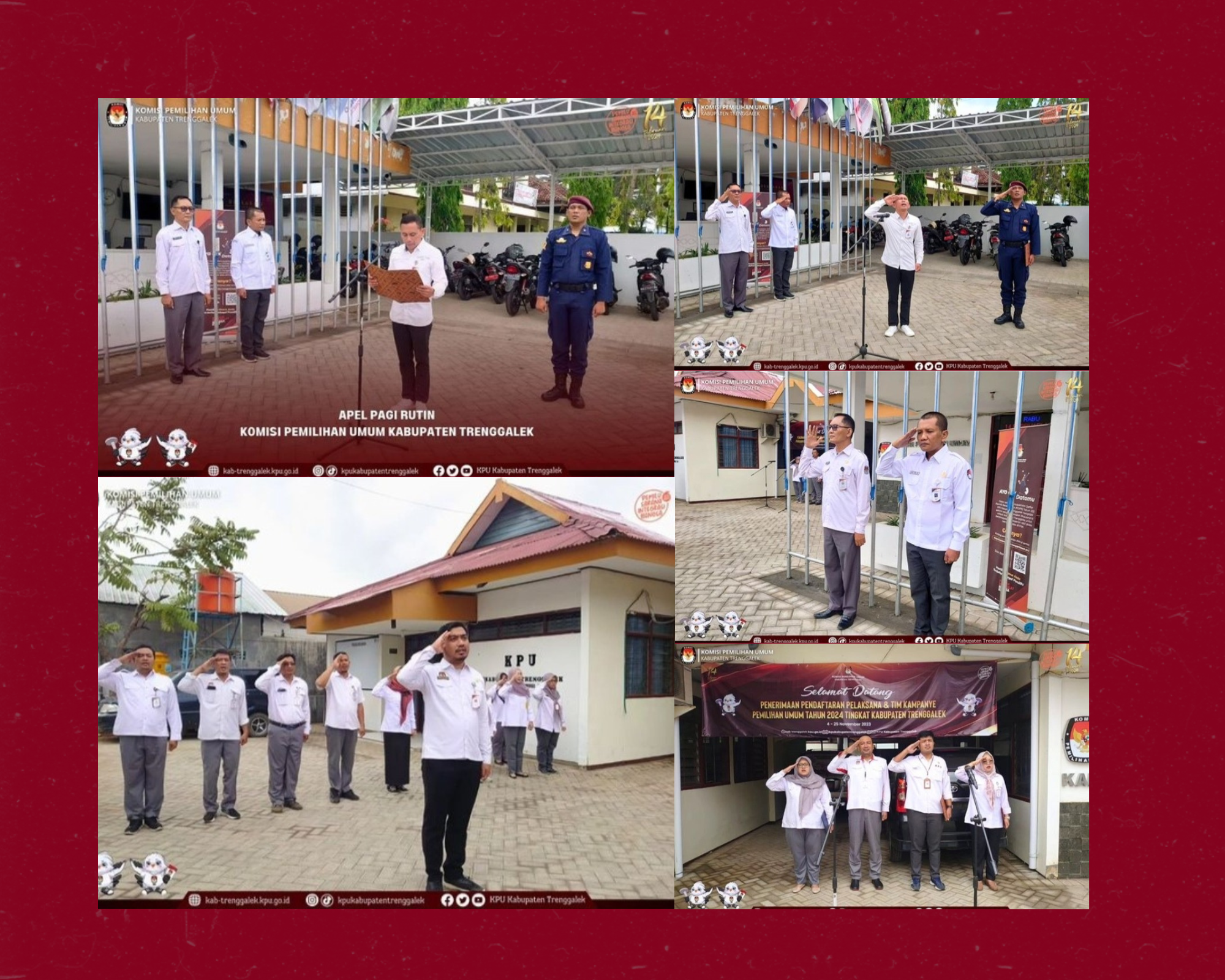 Hari ini, Senin, tanggal 20 November 2023, di halaman Kantor Komisi Pemilihan Umum (KPU) Kabupaten Trenggalek, seluruh pegawai KPU Kabupaten Trenggalek berbaris rapi. Para pegawai tersebut mengikuti Apel Pagi Rutin yang diselenggarakan sebagai wujud kedisiplinan. Apel pagi dimulai tepat pukul 08.00 WIB oleh MC. Apel dilanjutkan dengan penghormatan dan laporan kepada Pembina Apel Bertindak sebagai pemimpin Apel adalah Agung Tri Laksana, dan pembina apel adalah Gembong Derita Hadi, Ketua KPU Kabupaten Trenggalek. Selanjutnya Penghormatan Bendera Merah-Putih, Mengheningkan Cipta dan Pembacaan Pancasila. Apel berlanjut dengan Pembacaan Pembukaan Undang-Undang Dasar Negara Republik Indonesia Tahun 1945, dan Panca Prasetya Korps Pegawai Republik Indonesia. Setelah itu, amanat pembina apel.
