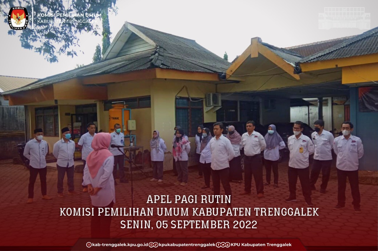 TRENGGALEK- Pada hari ini, Senin, 5 September 2022, berjajar dan berbaris rapi seluruh pegawai KPU Kabupaten Trenggalek mengikuti Apel Pagi Rutin mingguan yang dilaksanakan setiap hari Senin pagi pada pukul 7.30 WIB. Kegiatan tersebut diikuti oleh Ketua, Anggota, Sekretaris, Kasubbag, Staf PNS, dan PPNPN KPU Kabupaten Trenggalek.