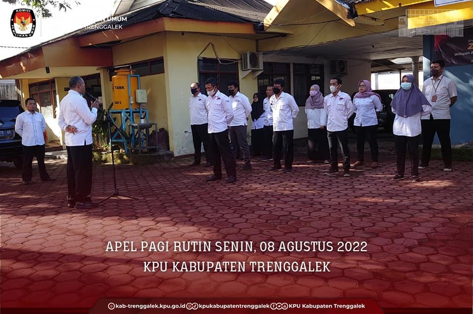 TRENGGALEK- Hari ini Senin, tanggal 8 Agustus 2022, KPU Kabupaten Trenggalek menyelenggarakan Apel Pagi Rutin. Kegiatan tersebut merupakan wujud kedisiplinan dan diikuti oleh seluruh pegawai KPU Kabupaten Trenggalek baik Komisioner maupun ASN dan PPNPN di lingkungan KPU Kabupaten Trenggalek. Apel pagi dimulai tepat pukul 08.00 WIB dipimpin oleh Agus Widodo, PPNPN KPU Kabupaten Trenggalek. Bertindak sebagai Pembina Apel adalah Wiratno, Sekretaris KPU Kabupaten Trenggalek.