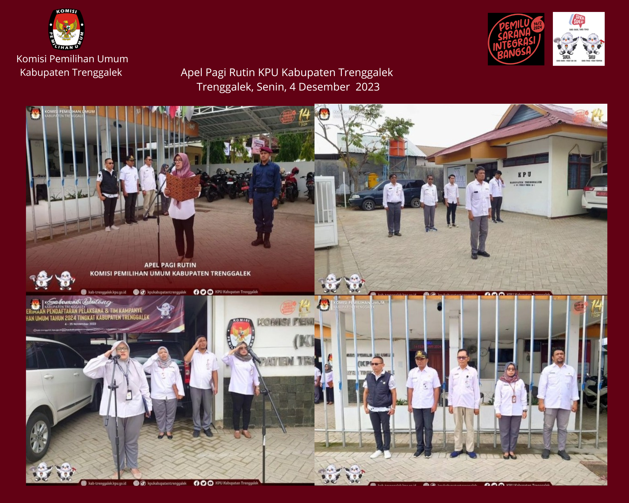 Hari ini, Senin, tanggal 4 Desember 2023, Komisi Pemilihan Umum Kabupaten Trenggalek menyelenggarakan Apel Pagi Rutin di halaman Kantor KPU Kabupaten Trenggalek. Apel tersebut diikuti oleh pegawai KPU Kabupaten Trenggalek. Bertindak sebagai Pembina Apel adalah Istatiin Nafiah, Anggota KPU Kabupaten Trenggalek yang membidangi Divisi Teknis Penyelenggaraan dan pemimpin Apel adalah Chormen Rukmawan. Apel dimulai tepat pukul 08.00 WIB oleh MC, Wulan Styaningsih. Setelah dilakukan Penghormatan dan Laporan kepada Pembina Apel, dilakukan Penghormatan kepada Bendera Merah-Putih diiringi Lagu Kebangsaan Indonesia Raya. Apel dilanjutkan dengan Pembacaan Pancasila oleh Pembina Apel yang diikuti oleh seluruh peserta apel. Selanjutnya, Pembacaan Pembukaan Undang-Undang Dasar Negara Republik Indonesia Tahun 1945 oleh petugas, Lilis Suryani dan Pembacaan Panca Prasetya Korps Pegawai Republik Indonesia oleh petugas, Woro Wikan Maheswari. Apel berlanjut amanat Pembina Apel.