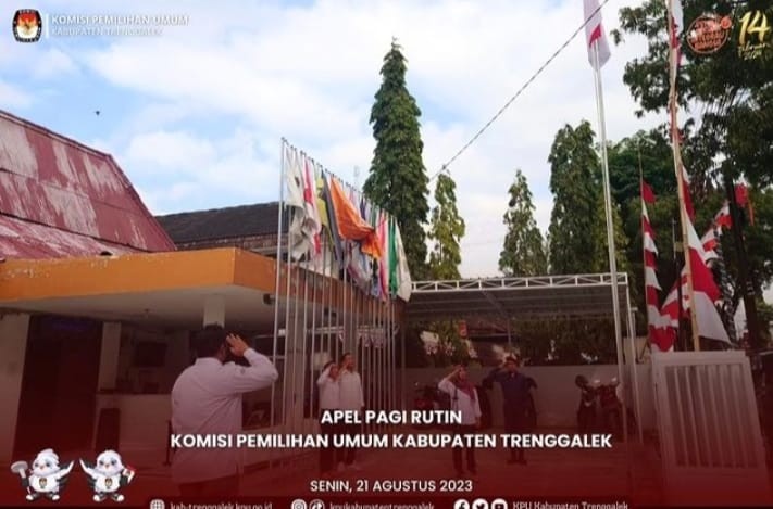 Hari ini, Senin, tanggal 21 Agustus 2023, di halaman Kantor KPU Kabupaten Trenggalek tampak berbaris rapi seluruh pegawai KPU Kabupaten Trenggalek yang meliputi Komisioner dan Sekretariat KPU Kabupaten Trenggalek. Seluruh pegawai KPU Kabupaten Trenggalek mengikuti Apel Pagi Rutin yang diselenggarakan sebagai wujud kedisiplinan dalam bekerja.