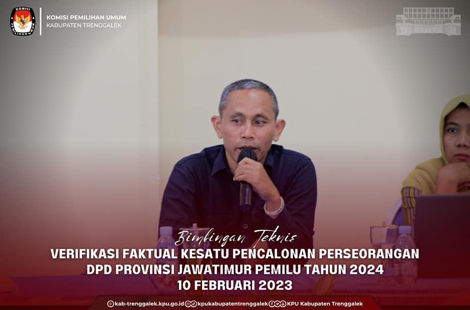 TRENGGALEK — Hari ini, Jumat, 10 Februari 2023, Komisi Pemilihan Umum (KPU) Kabupaten Trenggalek menggelar Bimbingan Teknis Verifikasi Faktual Kesatu Pencalonan Perseorangan DPD Pemilu Tahun 2024. Bimtek tersebut diikuti oleh seluruh verifikator faktual yang terdiri atas seluruh pegawai KPU Kabupaten Trenggalek, dan Panitia Pemilihan Kecamatan Divisi Teknis Penyelenggaraan se-Kabupaten Trenggalek. Kegiatan tersebut juga dihadiri Bawaslu Kabupaten Trenggalek dan Bakesbangpol Kabupaten Trenggalek. Kegiatan yang bertempat di Hall Hotel Hayam Wuruk tersebut dimulai pada pukul 13.00 WIB dan diawali Menyanyikan Lagu Kebangsaan Indonesia Raya dipandu oleh MC.