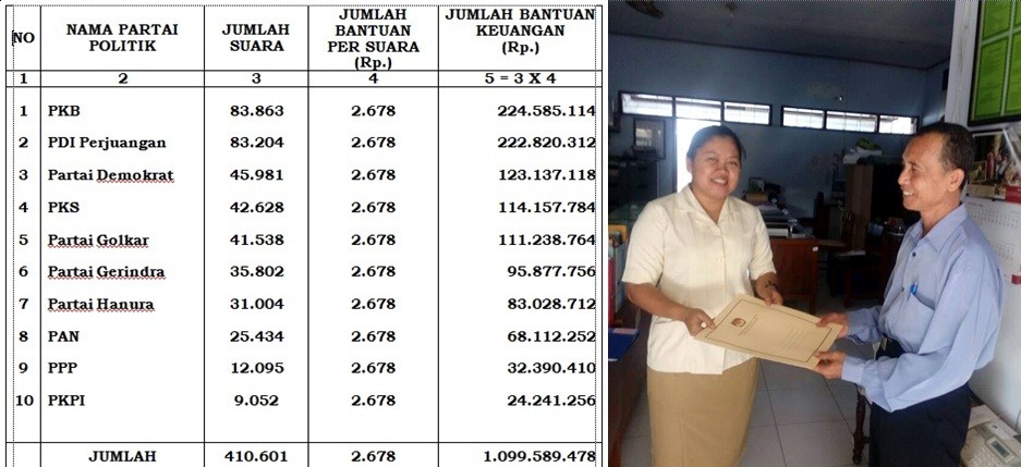 Kamis, 08 September 2016, kpu Kabupaten Trenggalek kembali kedatangan pengurus partai politik yang ingin memproses dana bantuan keuangan untuk partai politik dari pemerintah. Sebagaimana diatur dalam Peraturan Bupati Trenggalek Nomor 7 Tahun 2015 Tentang Pedoman Tata Cara Penghitungan, Penganggaran dalam Anggaran Pendapatan dan Belanja Daerah dan Tertib Administrasi Pengajuan, Penyaluran, dan Laporan Pertanggungjawaban Penggunaan Bantuan Keuangan kepada Partai Politik, salah satu syarat permohonan pengajuan Bantuan Keuangan Partai Politik harus melampirkan surat keterangan autentifikasi hasil penetapan perolehan kursi dan suara partai politik hasil pemilu tahun 2014 yang dilegalisir Ketua atau Sekretaris Komisi Pemilihan Umum Kabupaten Trenggalek.