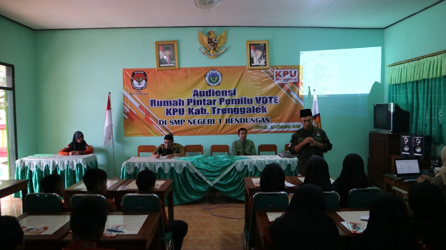 Rumah Pintar Pemilu merupakan tempat belajar bagi para pemilih dan pra-pemilih. Konsep pra-pemilih juga menjadi perhatian bagi KPU karena pendidikan pemilih adalah proses yang bersifat jangka panjang. Demikian ditegaskan oleh Nurani Divisi Sosialisasi-Pendidikan Pemilih, Partisipasi Masyarakat, dan Sumber Daya Manusia KPU Kabupaten Trenggalek. Hal itu disampaikan dalam memulai pemaparan materi audiensi Rumah Pintar Pemilu (RPP) “Vote” KPU Kabupaten Trenggalek di SMPN 1 Bendungan.
