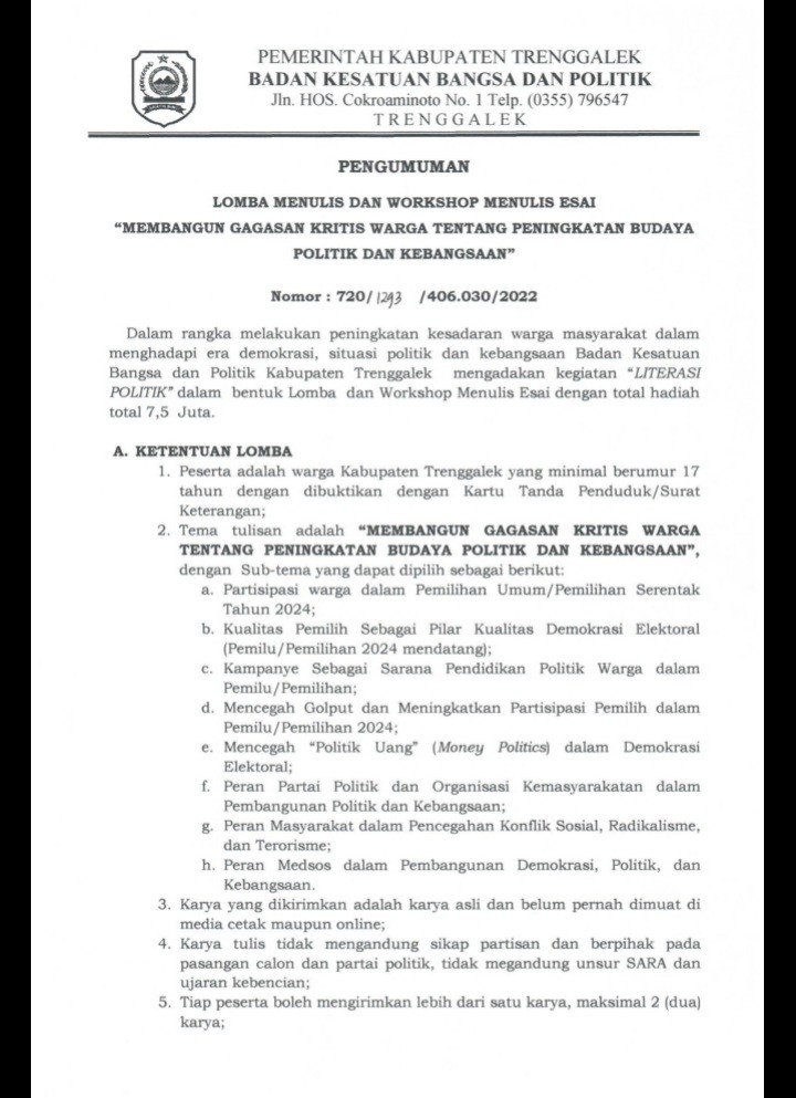 TRENGGALEK— Untuk meningkatkan kesadaran dan tradisi berpikir kritis terhadap fenomena politik, Kantor Kesatuan Bangsa dan Politik (Kesbangpol) Kabupaten Trenggalek mengadakan kegiatan yang dinamakan Literasi Politik. Kegiatan ini terdiri dari lomba menulis esai, workshop menulis esai, dan pemuatan karya para penulis di media cetal, online, dan buku kumpulan esai.