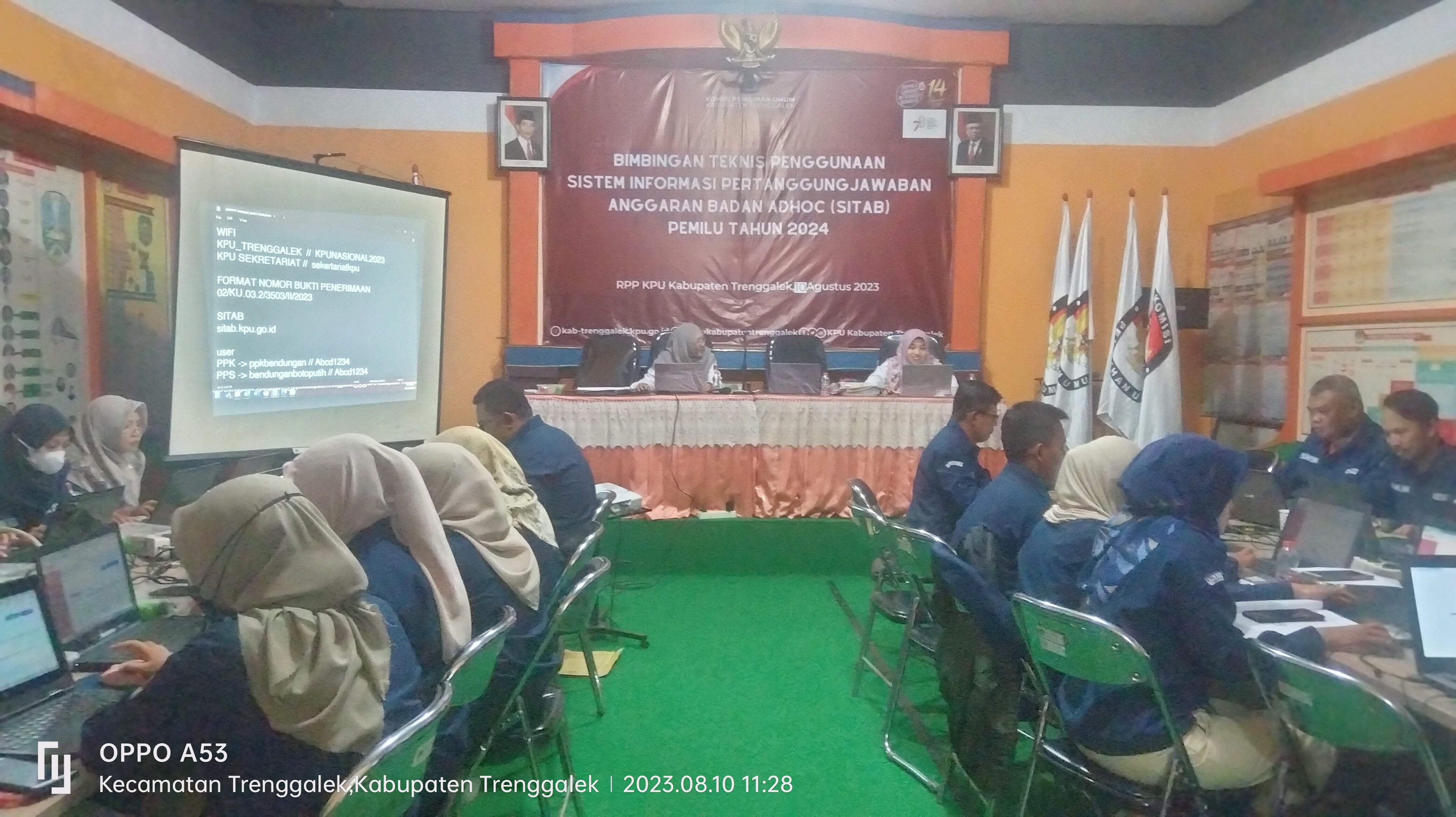 Hari ini, Kamis, tanggal 10 Agustus 2023, Komisi Pemilihan Umum (KPU) Kabupaten Trenggalek menyelenggarakan Bimbingan Teknis Penggunaan Sistem Informasi Pertanggungjawaban Anggaran Badan Adhoc (SItAB) Pemilu Tahun 2024 Gelombang Keempat. Kegiatan tersebut diikuti oleh pengelola keuangan dari Sekretariat PPK dan PPS se-Kecamatan Tugu dan Dongko. Kegiatan tersebut dimulai pada pukul 09.00 WIB dengan Menyanyikan Lagu Kebangsaan Indonesia Raya dan dilanjutkan Doa. Acara dibuka secara resmi oleh Sekretaris KPU Kabupaten Trenggalek, Wiratno.