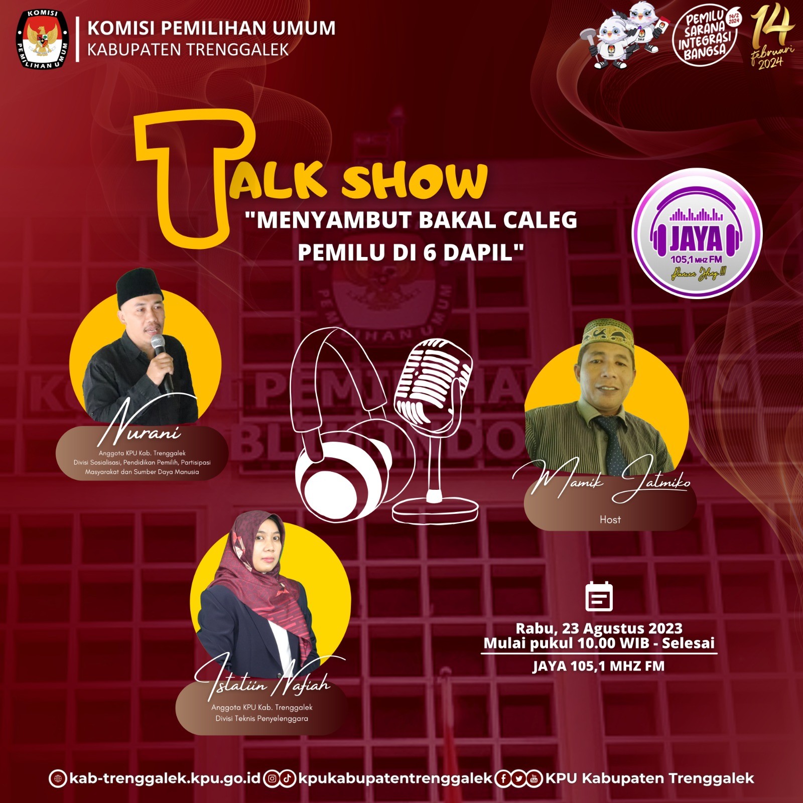 Untuk menggencarkan informasi dan mendorong partisipasi masyarakat di tahapan pengumuman daftar caleg sementara (DCS), KPU Trengalek akan menggelar sosialisasi di radio. Siaran tersebut bekerjasama dengan Radio Jaya 105,1 FM. Talk Show tersebut mengambil topik Menyambut Bakal Caleg di 6 Dapil yang dapat diikuti di Radio Jaya 105,1 MHz FM pada hari Rabu, 23 Agustus 2023, pukul 10.00 WIB.
