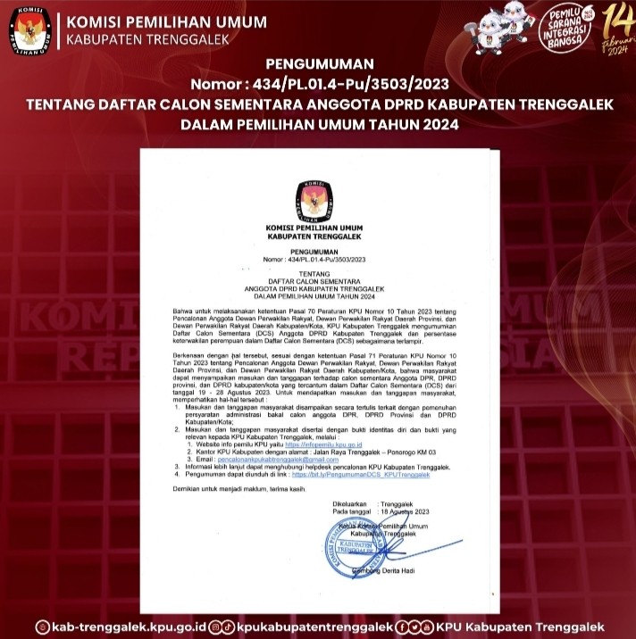 Hari ini, Sabtu, tanggal 19 Agustus 2023, Komisi Pemilihan Umum (KPU) Kabupaten Trenggalek mulai mengumumkan nama-nama Calon Anggota DPRD Kabupaten Trenggalek Pemilu Tahun 2024. Pengumuman tersebut sesuai dengan tahapan, program, dan jadwal dilaksanakan mulai tanggal 19 sampai dengan 28 Agustus 2023. KPU Kabupaten Trenggalek memasang pengumuman tersebut pada website, media sosial resmi KPU Kabupaten Trenggalek dan media massa baik cetak maupun online. Menurut Istatiin Nafiah, Anggota KPU Kabupaten Trenggalek Divisi Teknis Penyelenggaraan, hal itu untuk memudahkan masyarakat mengetahui nama-nama calon Anggota DPRD Kabupaten Trenggalek Pemilu Tahun 2024. Dijelaskannya, masyarakat dapat memberikan tanggapan dan masukan terhadap nama-nama calon Anggota DPRD Kabupaten Trenggalek Pemilu Tahun 2024 yang masuk dalam DCS tersebut. Tentunya, dirinya mengingatkan agar tanggapan dan masukan tersebut bersifat objektif. Selain itu, pelapor harus menyertakan identitas diri. Istatiin mengatakan bahwa identitas pelapor akan dirahasiakan dan tidak disebar-luaskan.