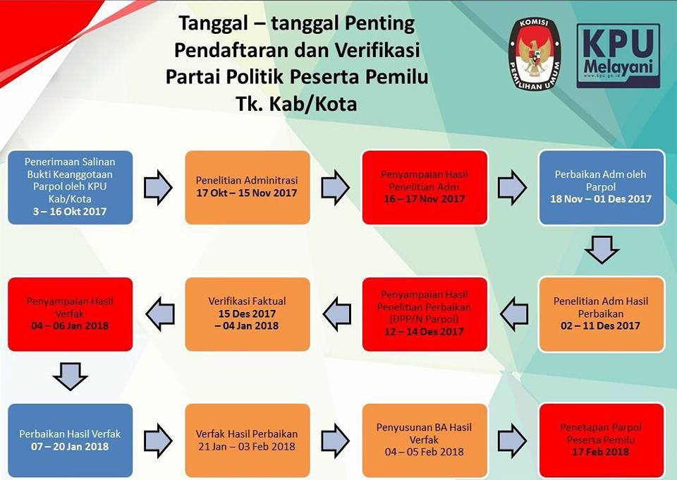 Sebagaimana jadwal yang ditetapkan oleh Peraturan Komisi Pemilihan Umum (KPU) Republik Indonesia Nomor 7 Tahun 2017, hari ini (Selasa, 03/10/2017) merupakan hari pertama dibukanya pendaftaran partai politik peserta pemilu. Salah satu agenda yang dilakukan pada tingkat Kabupaten/Kota adalah mulainya dibuka jadwal penerimaan salinan bukti keanggotaan partai politik dari Partai Politik tingkat Kabupaten/Kota kepada oleh KPU/KIP Kabupaten/Kota.