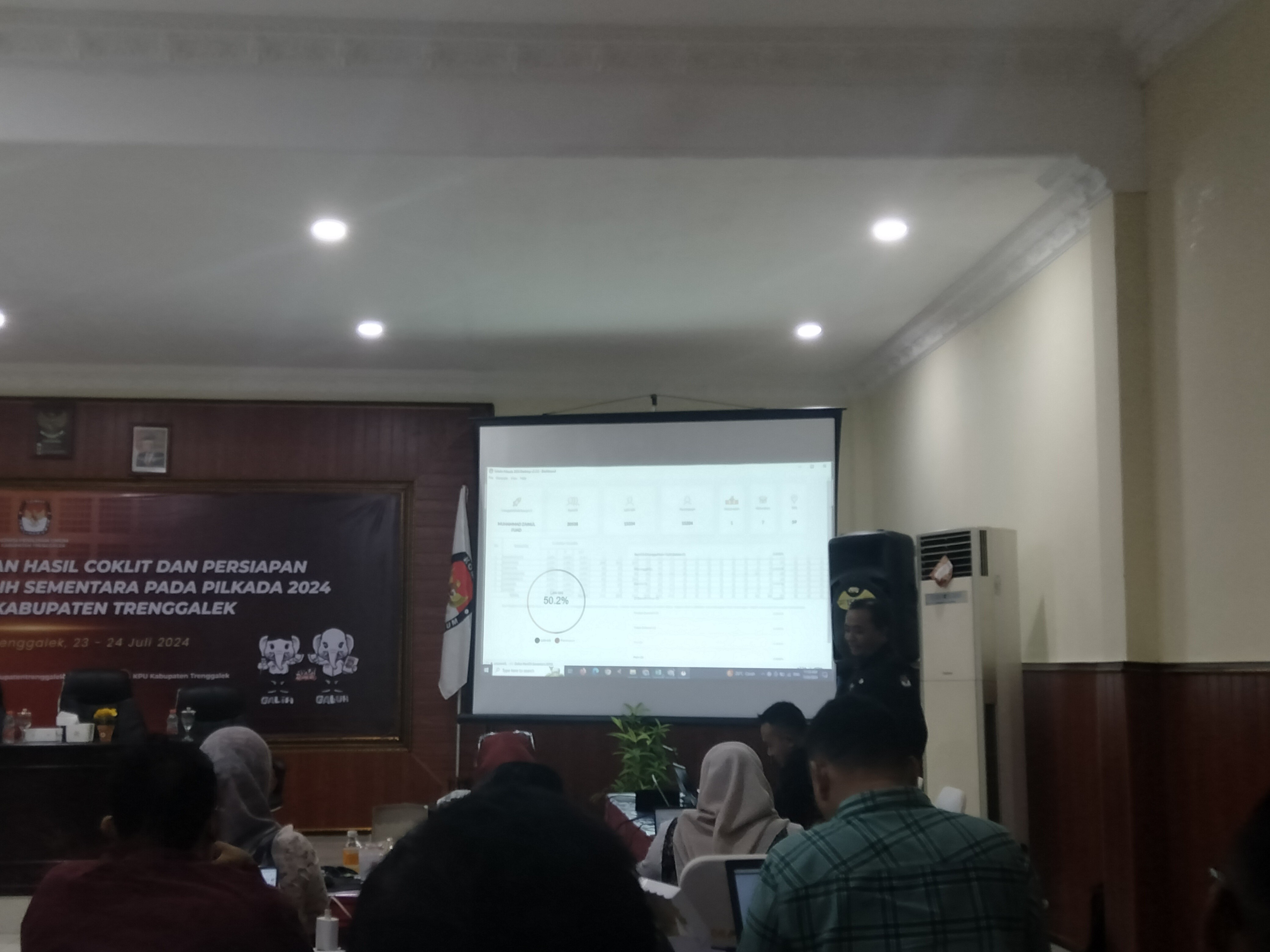 Hari ini, Rabu, tanggal 24 Juli 2024 merupakan hari kedua pelaksanaan Rapat Kerja Pemantauan Hasil Coklit dan Persiapan Penyusunan Daftar Pemilih Sementara pada Pemilihan Serentak 2024 bersama PPK se-Kabupaten Trenggalek. Kegiatan yang diselenggarakan di Hall Rumah Makan Mekarsari Trenggalek tersebut dihadiri oleh dua orang Anggota KPU Kabupaten Trenggalek yaitu Mahbubil Umam, Divisi Perencanaan, Data dan Informasi serta Ali Sadad, Anggota KPU Kabupaten Trenggalek Divisi Teknis Penyelenggaraan. Acara hari kedua dibuka secara resmi oleh Ketua KPU Kabupaten Trenggalek yang dalam kesempatan ini diwakili oleh Mahbubil Umam, Anggota KPU Kabupaten Trenggalek Divisi Perencanaan, Data dan Informasi.
