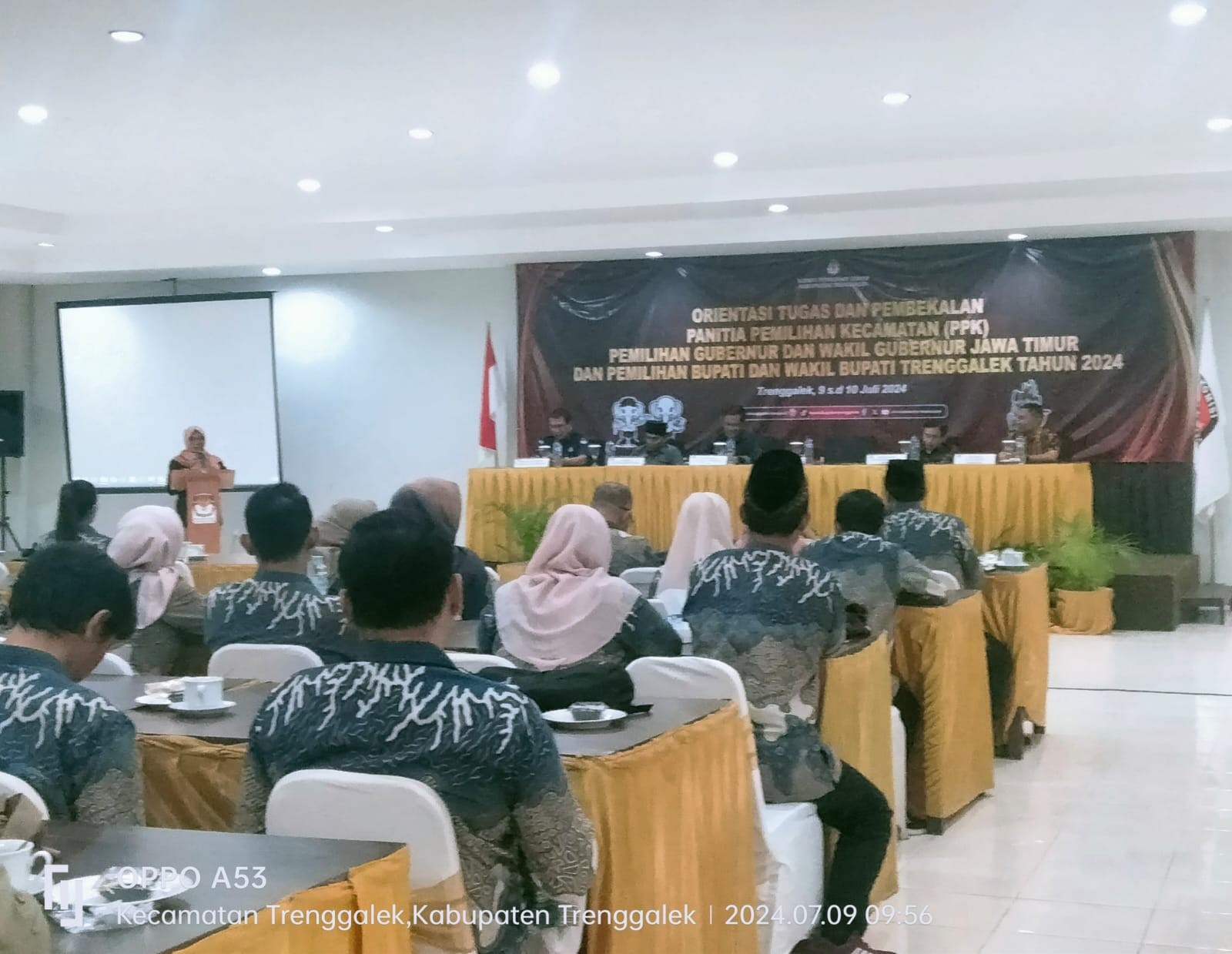 Hari ini, Selasa, tanggal 9 Juli 2024, merupakan hari pertama Komisi Pemilihan Umum Kabupaten Trenggalek menyelenggarakan Orientasi Tugas dan Pembekalan Panitia Pemilihan Kecamatan Pemilihan Gubernur dan Wakil Gubernur Jawa Timur serta Pemilihan Bupati dan Wakil Bupati Trenggalek Tahun 2024. Kegiatan yang diselenggarakan di Hall Hotel Bukit Jaas Permai tersebut dihadiri oleh Ketua dan Seluruh Anggota KPU Kabupaten Trenggalek, Sekretaris beserta jajaran Sekretariat KPU Kabupaten Trenggalek, Bawaslu Kabupaten Trenggalek, Staf Ahli DKPP, Bakesbangpol Trenggalek, seluruh Ketua dan Anggota PPK beserta Sekretariat PPK se-Kabupaten Trenggalek, Acara dimulai pukul 10.00 WIB oleh MC dan diawali dengan Menyanyikan Lagu Kebangsaan Indonesia Raya yang dipimpin oleh Dirigen. Acara dilanjutkan dengan Pembacaan Doa yang dipimpin oleh Misdiyanto, Kasubbag Teknis Penyelenggaraan Pemilu, Partisipasi dan Hubungan Masyarakat. Acara dilanjutkan dengan Laporan Panitia yang disampaikan oleh Sekretaris KPU Kabupaten Trenggalek, Nanang Eko Prasetyo.