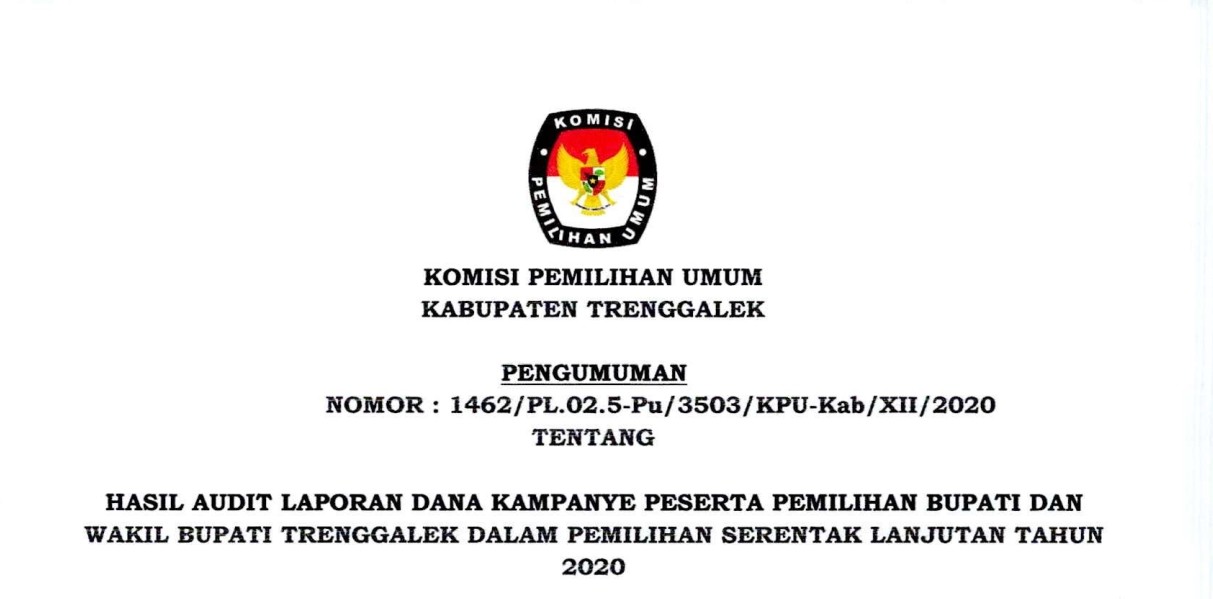 Berikut disampaikan PENGUMUMAN NOMOR : 1462/PL.02.5-Pu/3503/KPU-Kab/XII/2020 TENTANG HASIL AUDIT LAPORAN DANA KAMPANYE PESERTA PEMILIHAN BUPATI DAN WAKIL BUPATI TRENGGALEK DAL AM PEMILIHAN SERENTAK LANJUTAN TAHUN 2020.