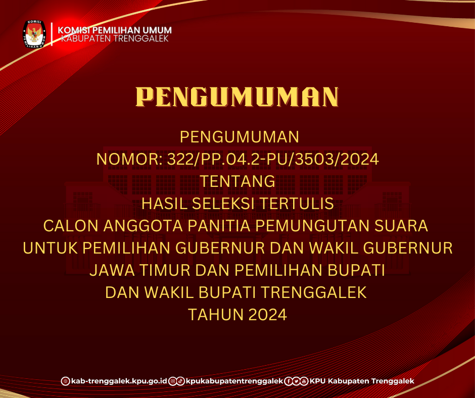 HASIL SELEKSI TERTULIS CALON ANGGOTA PANITIA PEMUNGUTAN SUARA UNTUK PEMILIHAN GUBERNUR DAN WAKIL GUBERNUR JAWA TIMUR DAN PEMILIHAN BUPATI DAN WAKIL BUPATI TRENGGALEK TAHUN 2024