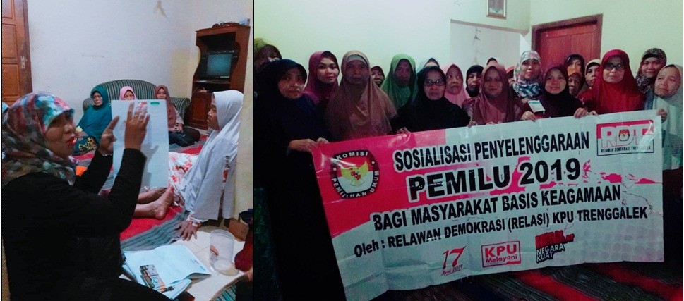 TRENGGALEK, 02/02/2019— Pada tanggal 02 Februari 2019, salah seorang Relawan Demokrasi Trenggalek (RDT) dari segmen Keagamaan mengadakan sosialisasi ke Jamaah Yasin ibu-ibu RW 03 Desa Suruh di rumah Ibu Asih yg di hadiri Jamaah sekitar 65 an jamaah.