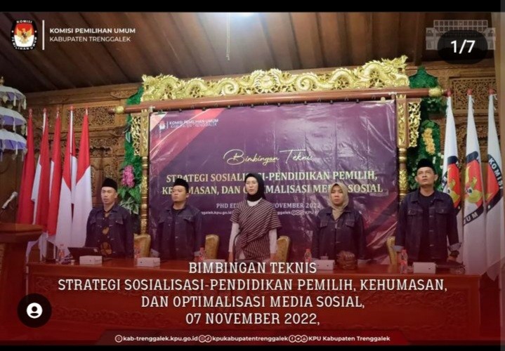 TRENGGALEK— Untuk mengonsolidasikan kekuatan kehumasan di kalangan internal, Komisi Pemilihan Umum (KPU) Kabupaten Trenggalek adakan kegiatan Bimbingan Teknis Strategi Sosialisasi, Kehumasan dan Optimalisasi Media Sosial dalam menyambut Pemilu 2024. Kegiatan dilaksanakan pada tanggal 7 November 2020, bertempat di Pendopo Edufarm, Dukuh Lotekol, Desa Malasan, Kecamatan Durenan, kabupaten Trenggalek.