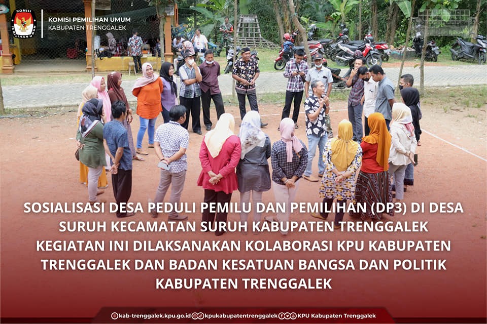 TRENGGALEK— Pembentukan kader Desa Peduli Pemilu dan Pemilihan (DP3) terus dilakukan oleh Komisi Pemilihan Umum (KPU) Kabupaten Trenggalek. Kali ini KPU Kabupaten Trenggalek menyasar di Desa Suruh. Salah satu Desa di kecamatan suruh ini terletak kira-kira sekitar 20 kilometer dari Kantor KPU Kabupaten Trenggalek.