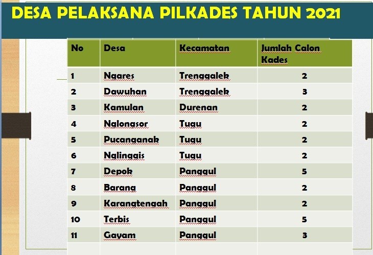 15 Desa yang menyelenggarakan Pilkades antara lain ada di Kecamatan Trenggalek, ada dua desa yaitu Desa Ngares dan Dawuhan, di kecamatan Durenan satu desa (Desa Kamulan), di Kecamatan Tugu ada tiga desa (Nglongsor, Nglinggis, dan Desa Pucanganak), di Kecamatan Panggul ada empat Desa (Desa Depok, Karangtengah, Terbis, dan Gayam), di Kecamatan Watulimo ada dua desa (Desa Ngembel dan Watulimo), di Desa Suruh ada satu Desa (Desa Mlinjon), dan di Kecamatan Dongko ada satu desa (Pandean).