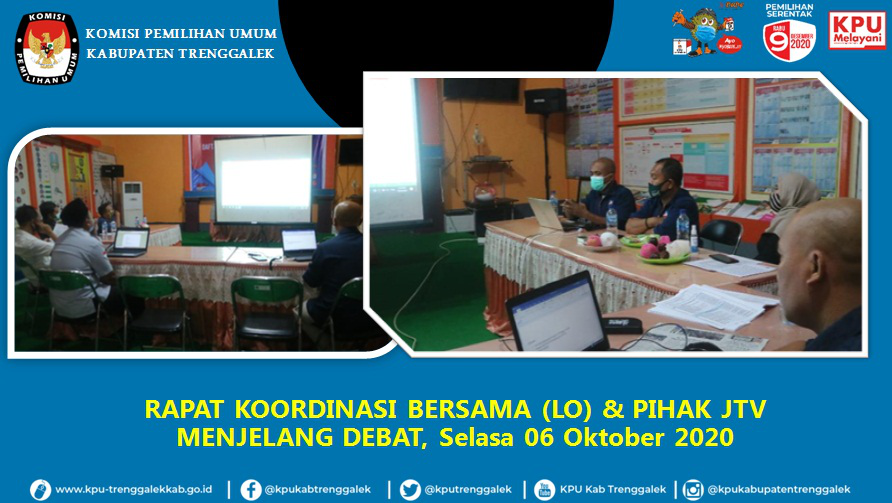 Debat Publik Putaran I akan digelar Komisi Pemilihan Umum (KPU) Kabupaten Trenggalek pada tanggal 08 Oktober 2020 pukul 19.00 WIB di Jawa Pos TV (JTV) Surabaya. Untuk memastikan lancarnya kegiatan debat publik I, hari ini (06/10/2020) diadakan rapat pembuatan kesepakatan antara kedua Tim Paslon dan disaksikan oleh KPU Kabupaten Trenggalek bersama tim produksi debat Publik JTV.
