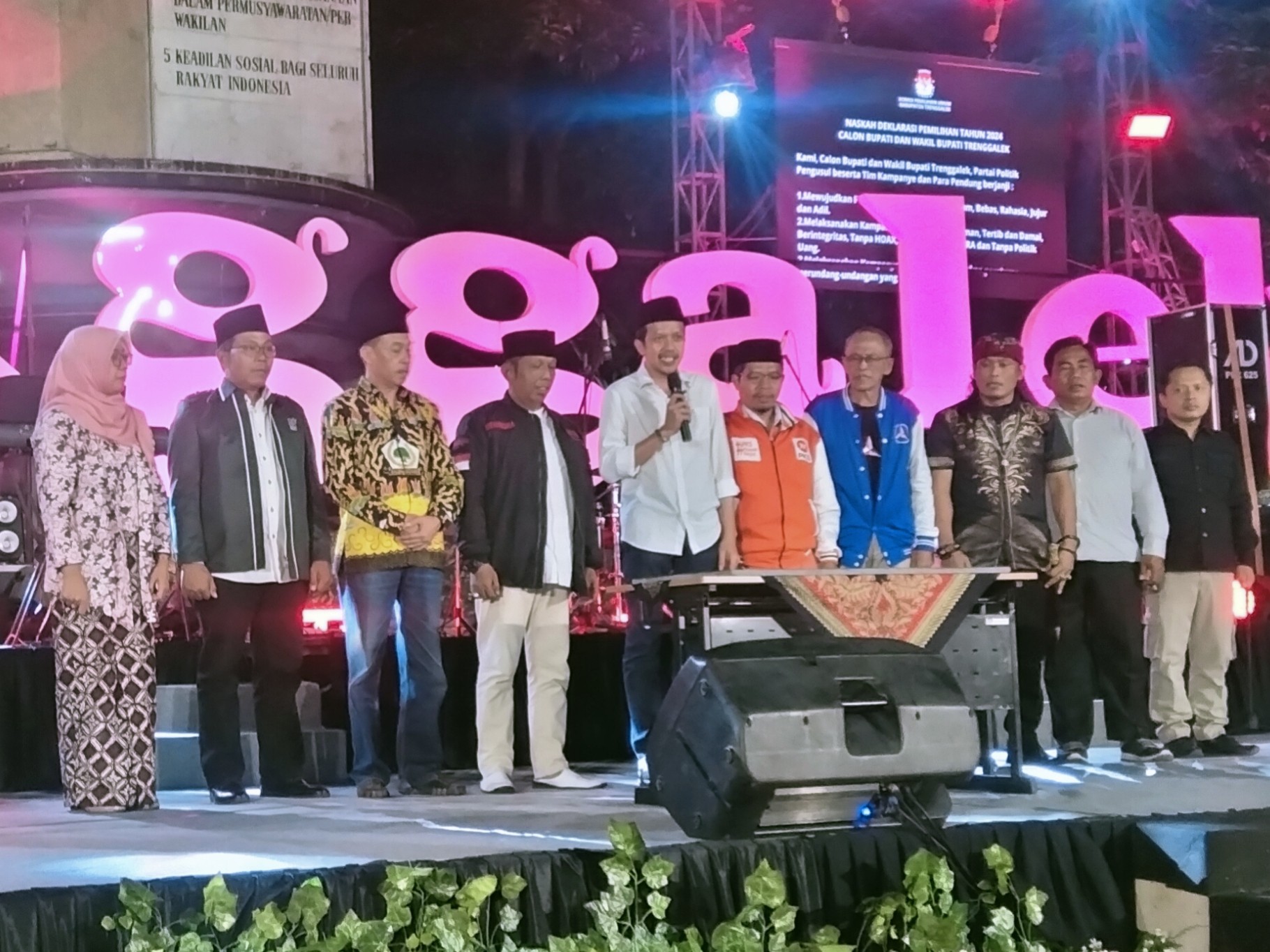 Hari ini, Selasa, tanggal 24 September 2024, KPU Kabupaten Trenggalek menyelenggarakan Deklarasi Kampanye Damai. Kegiatan yang diselenggarakan di Alun-alun Trenggalek tersebut dihadiri oleh Calon Wakil Bupati Trenggalek Tahun 2024, Syah Muhamad Nata Negara, Forkopimda, Ketua dan seluruh Anggota KPU Kabupaten Trenggalek beserta jajaran Sekretariat KPU Kabupaten Trenggalek, Bawaslu Kabupaten Trenggalek, Camat se-kabupaten Trenggalek, OPD terkait, Ketua dan Anggota KPU Kabupaten Trenggalek Periode 2019-2024, tokoh agama dan tokoh masyarakat, PPK se-Kabupaten Trenggalek, dan media massa. Kegiatan dimulai pukul 20.00 oleh MC diawali Menyanyikan Lagu Kebangsaan Indonesia Raya yang dipimpin oleh Dirigen. Acara dilanjutkan dengan Pembacaan Doa yang dipimpin oleh Ustadz Wildan Oktavian. Acara dibuka secara resmi oleh Ketua KPU Kabupaten Trenggalek, Istatiin Nafiah, pada pukul 20.30 WIB.
