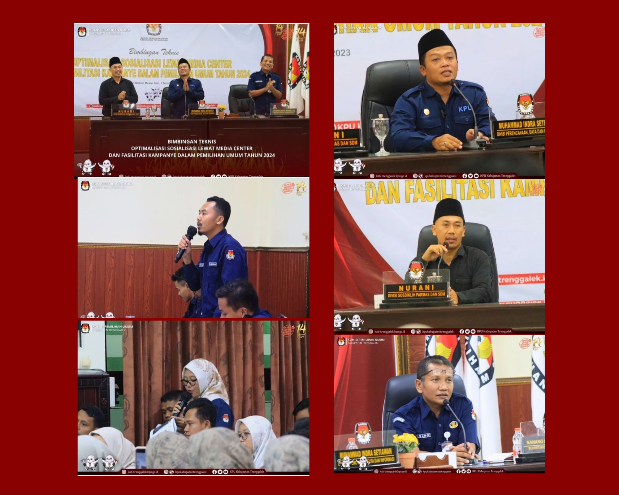 Hari ini, Selasa, 7 November 2023, Komisi Pemilihan Umum Kabupaten Trenggalek menyelenggarakan kegiatan Bimbingan Teknis Optimalisasi Sosialisasi Lewat Media Center dan Fasilitasi Kampanye. Kegiatan yang diselenggarakan di Hall Rumah Makan Mekarsari tersebut diikuti oleh seluruh pegawai KPU Kabupaten Trenggalek, PPK Divisi Parmas dan Hukum, Tenaga Pendukung Sekretariat PPK, Perwakilan PPS, serta praktisi media. Acara dimulai pukul 13.00 WIB oleh MC, Woro Wikan Maheswari. Diawali Menyanyikan Lagu Kebangsaan Indonesia Raya dengan dirigen Dian Satriana dan dilanjutkan dengan Doa yang dipimpin oleh Haji Misdiyanto, Kasubbag Teknis Penyelenggaraan Pemilu, Partisipasi dan Hubungan Masyarakat. Acara dibuka secara resmi oleh Ketua KPU Kabupaten Trenggalek yang dalam kesempatan ini diwakili oleh Muhammad Indra Setiawan, Anggota KPU Kabupaten Trenggalek Divisi Perencanaan, Data dan Informasi.