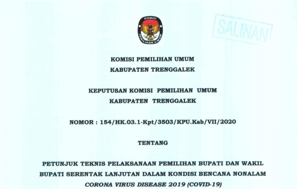 Berikut disampaikan keputusan Komisi Pemilihan Umum Nomor: 154/HK.03.1-Kpt/3503/KPU.Kab/VII/2020 tentang PETUNJUK TEKNIS PELAKSANAAN PEMILIHAN BUPATI DAN WAKIL BUPATI SERENTAK LANJUTAN DALAM KONDISI BENCANA NONALAM CORONA VIRUS DISEASE 2019 (COVID-19).
