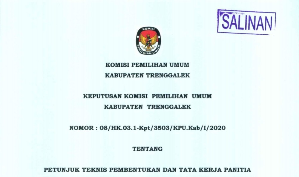 Berikut disampaikan Keputusan Komisi Pemilihan Umum Kabupaten Trenggalek Nomor: 08/HK.03.1-Kpt/3503/KPU.Kab/I/2020 Tentang Petunjuk Teknis Pembentukan dan Tata Kerja Panitia Pemilihan Kecamatan, Panitia Pemungutan Suara, dan Kelompok Penyelenggara Pemungutan Suara Dalam Pemilihan Bupati dan Wakil Bupati Trenggalek tahun 2020.