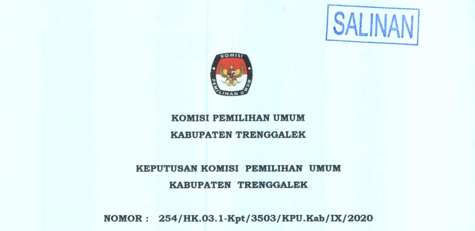 Keputusan Komisi Pemilihan Umum Kabupaten Trenggalek Nomor: 254/HK.03.1-Kpt/3503/KPU.Kab/IX/2020 selengkapnya dapat diunduh di sini.