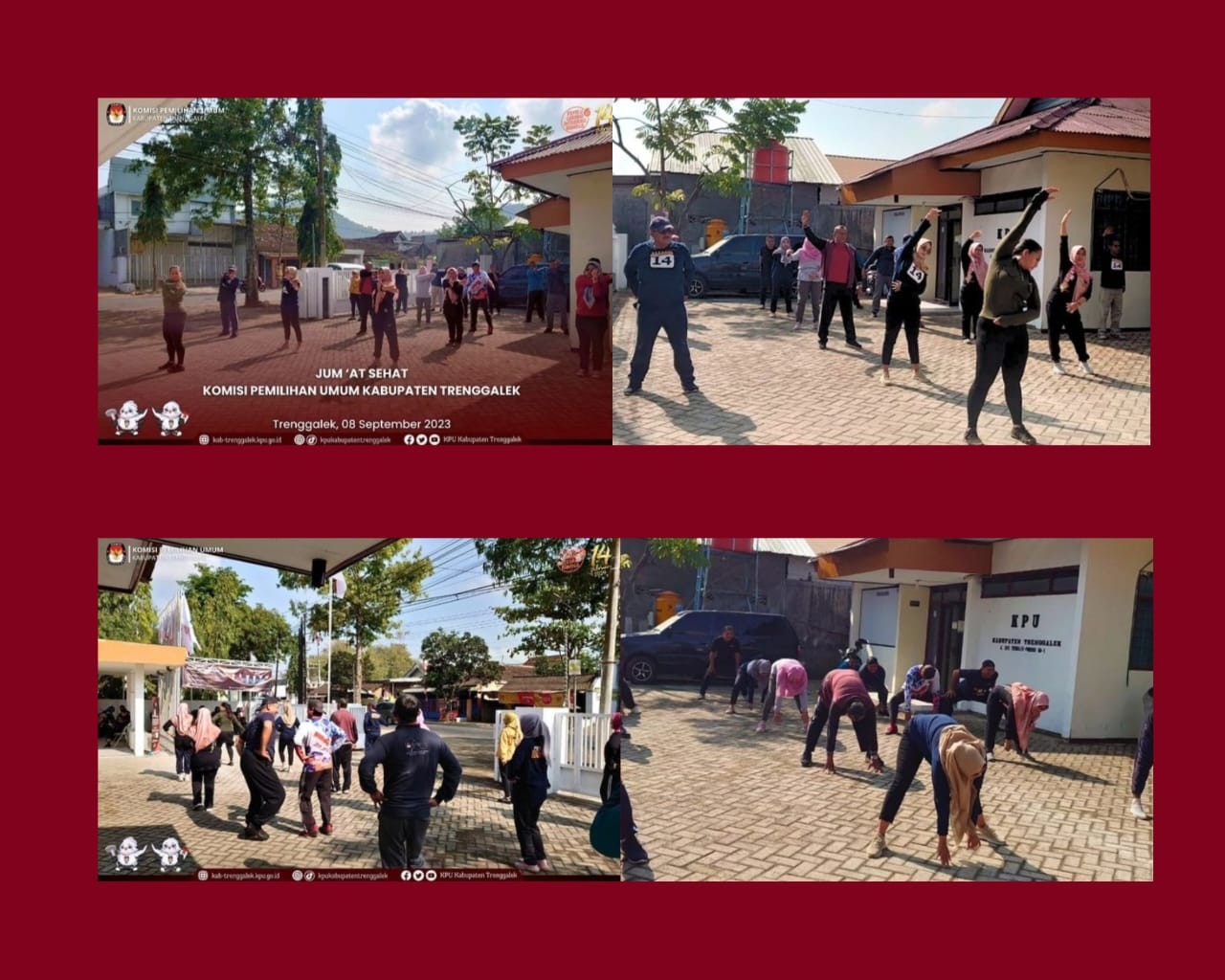 Hari ini, Jumat, tanggal 8 September 2023, seluruh pegawai KPU Kabupaten Trenggalek menyelenggarakan Senam Pagi dengan mendatangkan instruktur senam. Kegiatan tersebut dimulai pada pukul 08.00 WIB. Sesekali terdengar canda-tawa pegawai KPU Kabupaten Trenggalek yang antusias mengikuti senam.