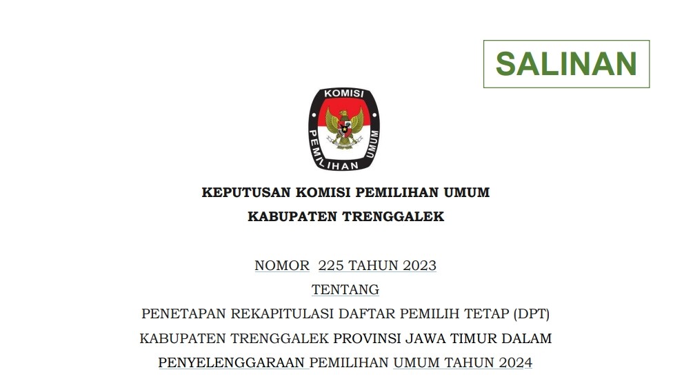 Trenggalek - Keputusan Komisi Pemilihan Umum Kabupaten Trenggalek Nomor 225 Tahun 2023 Tentang Penetapan Rekapitulasi Daftar Pemilih Tetap (DPT) Kabupaten Trenggalek Provinsi Jawa Timur dalam Penyelenggaraan Pemilihan Umum Tahun 2024 Unduh.